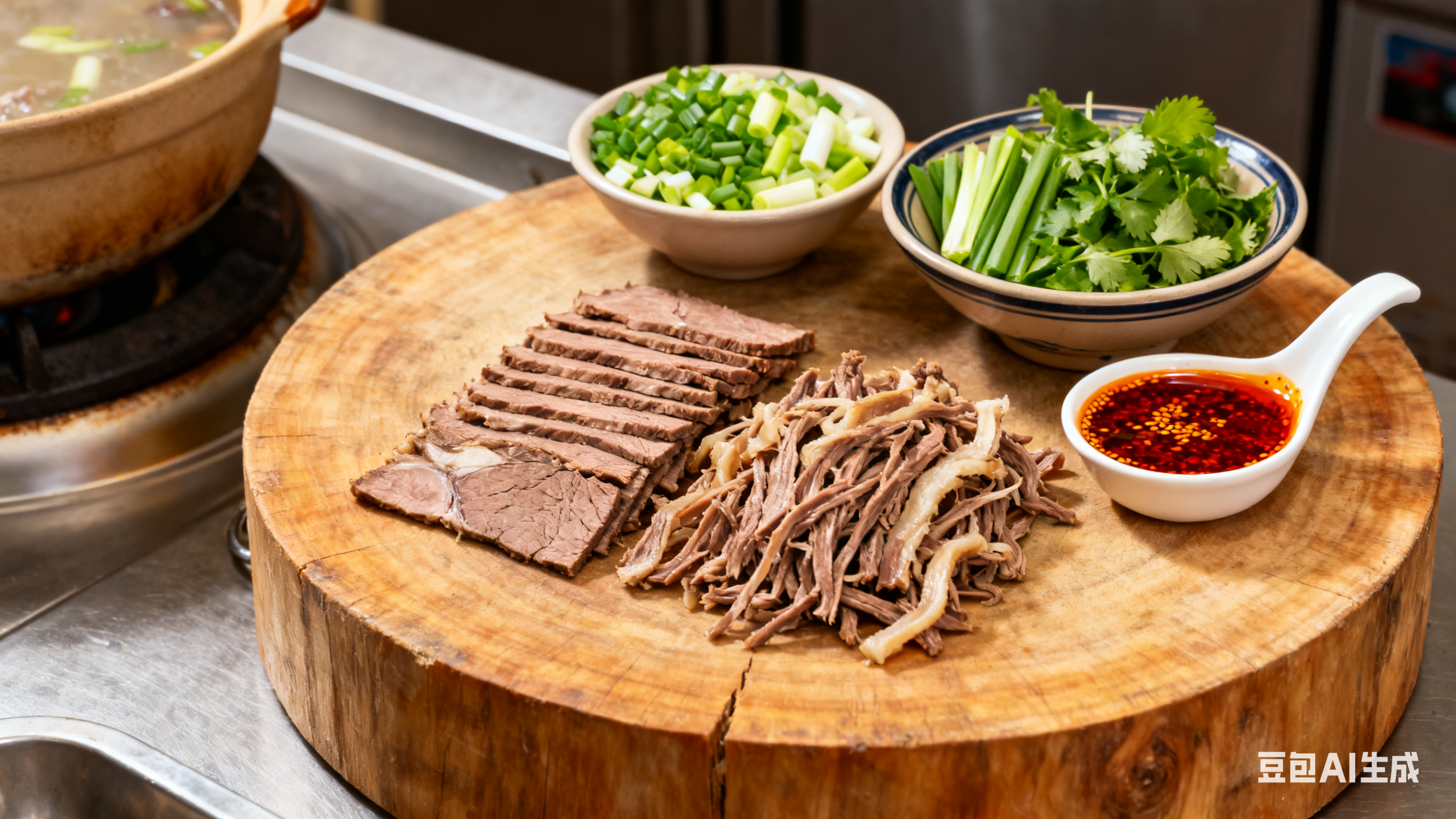 湯好,肉亦有門(mén)道。煮至軟爛的牛肉撈出,放涼后切薄片或粗絲,牛腱肉帶筋,嚼著彈牙;牛肋條帶脂,入口綿潤(rùn),按需選取,碼在碗底,撒一把蔥花、香菜,愛(ài)吃辣便加勺現(xiàn)炸的辣椒油,紅亮提香,不嗆喉。