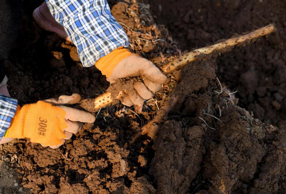 河南省焦作市溫縣祥云鎮(zhèn)關(guān)肇村農(nóng)民在田間收獲鐵棍山藥。新華社記者郝源 攝