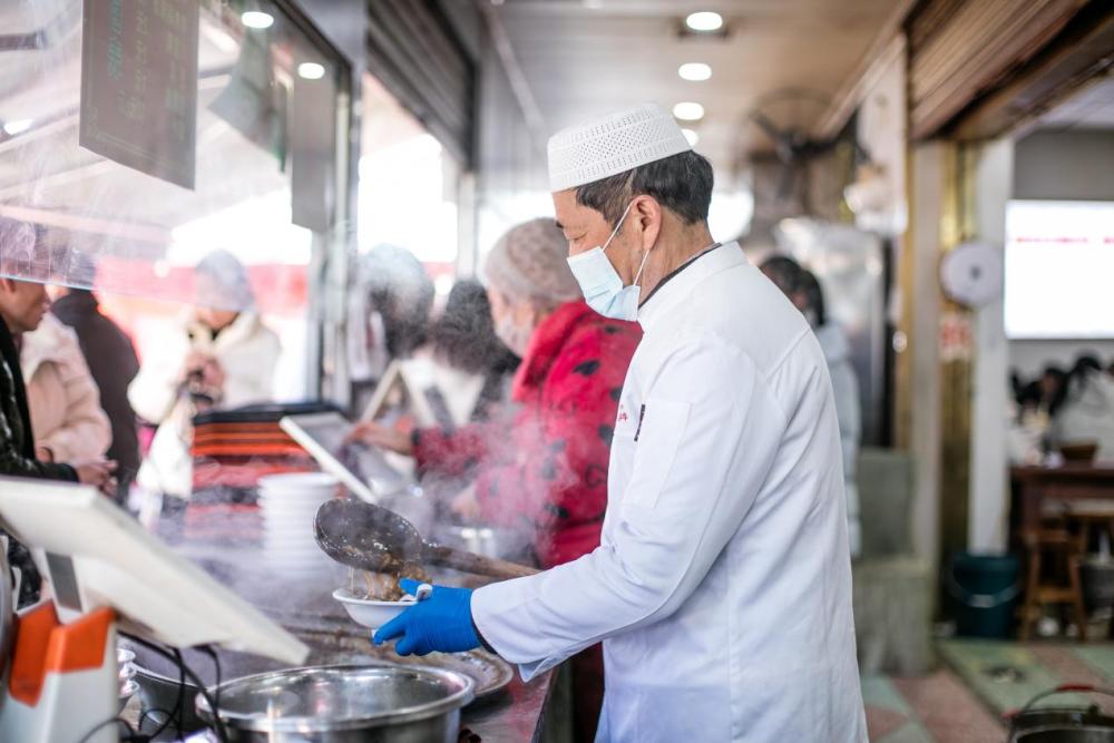 在漯河市北舞渡鎮(zhèn)胡辣湯店,工作人員在為食客盛胡辣湯。新華社 發(fā)