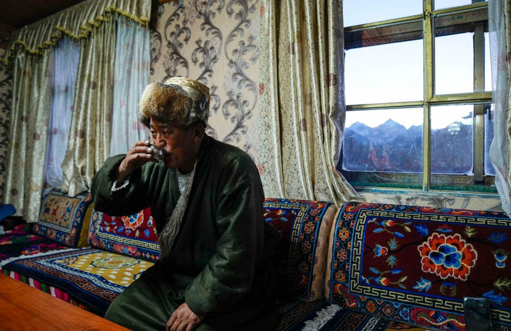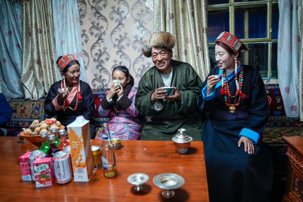在阿里地區普蘭縣科迦村,加央卓瑪的父親在喝青稞酒(12月18日攝)。