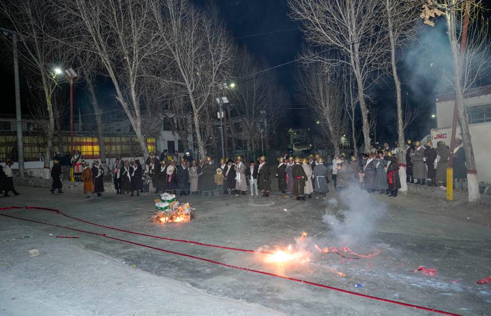 在阿里地區普蘭縣科迦村,村民們放鞭炮慶祝“古突”夜(12月18日攝)。