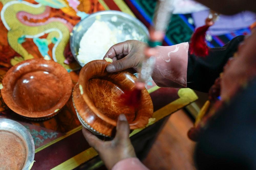 在阿里地區普蘭縣科迦村,加央卓瑪的表姐在裝飾盛放青稞酒的木碗(12月18日攝)。