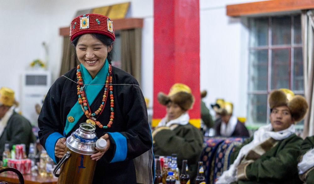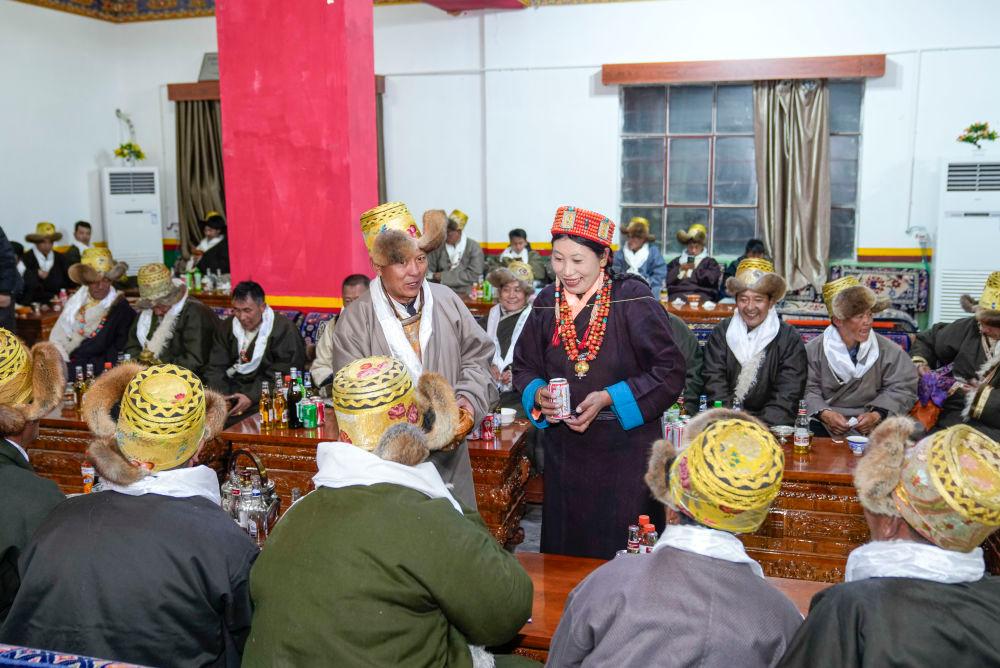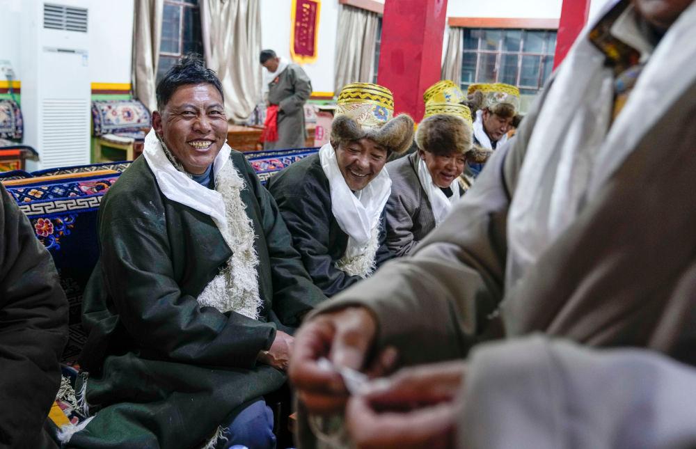 在阿里地區普蘭縣科迦村,村民獻唱祝酒歌(12月18日攝)。