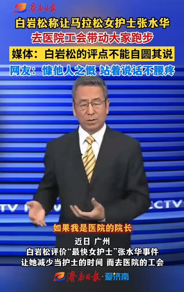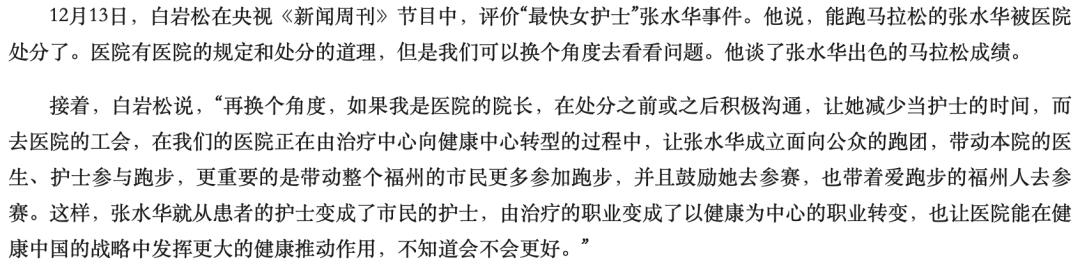 最主要的原因,是白巖松對某女護士編造虛假理由獲取調休去參加馬拉松比賽的事,是這樣發表自己的看法的: