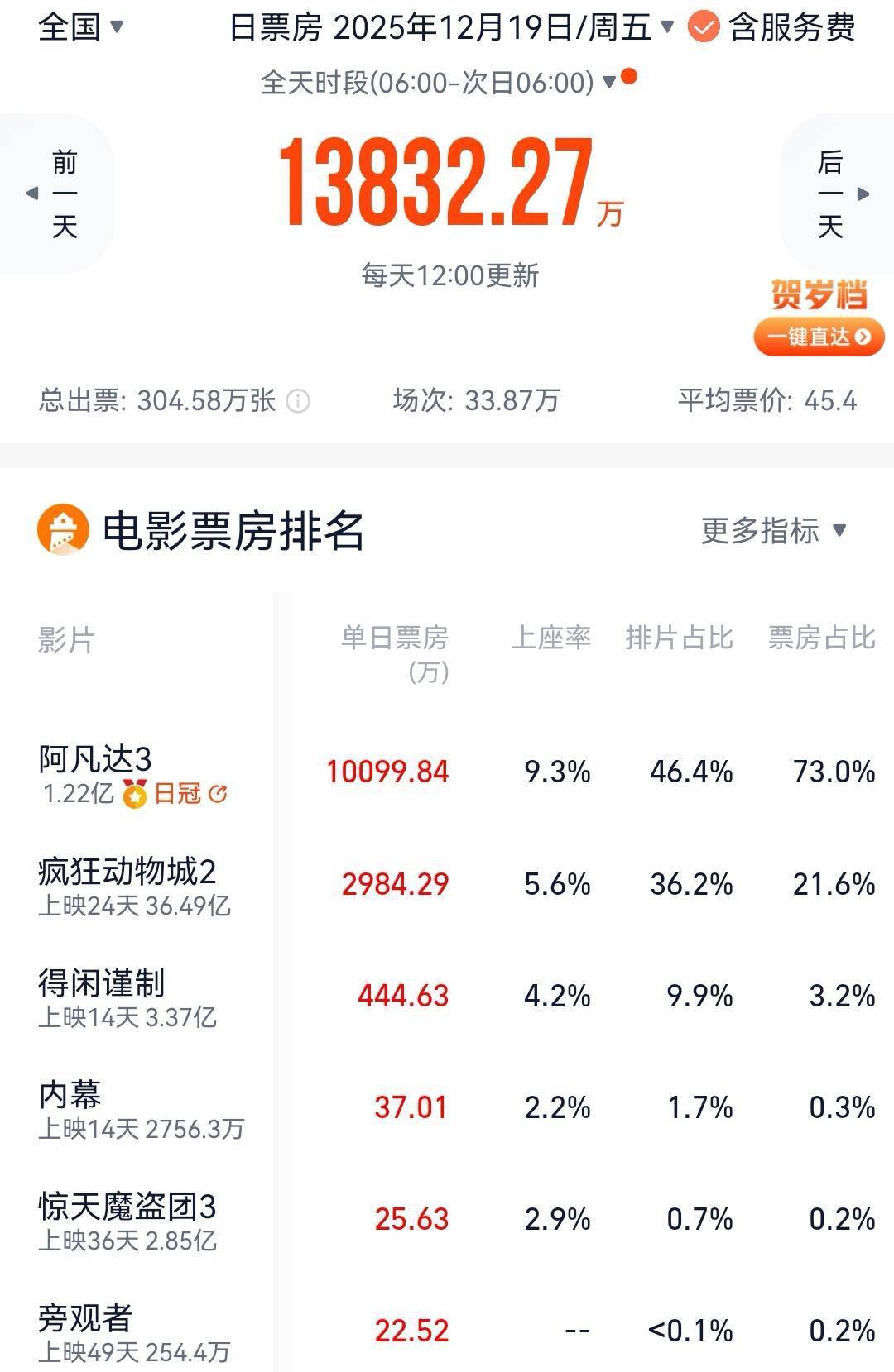 搜狐娛樂訊 (哈麥/文)12月19日周五,《阿凡達3》正式上映,首日排片占比46.4%,收票房1億元,上座率9.3%。