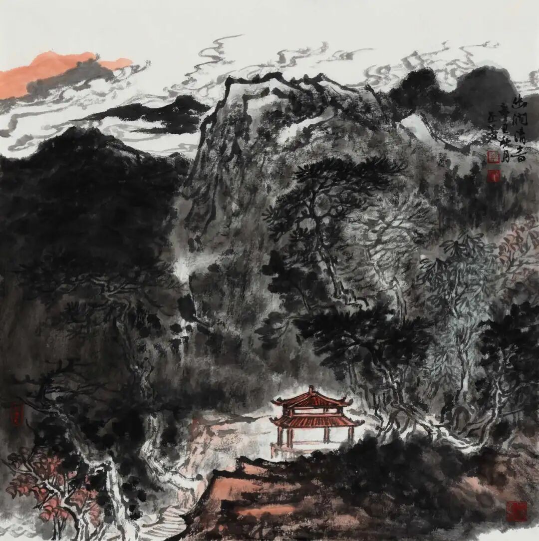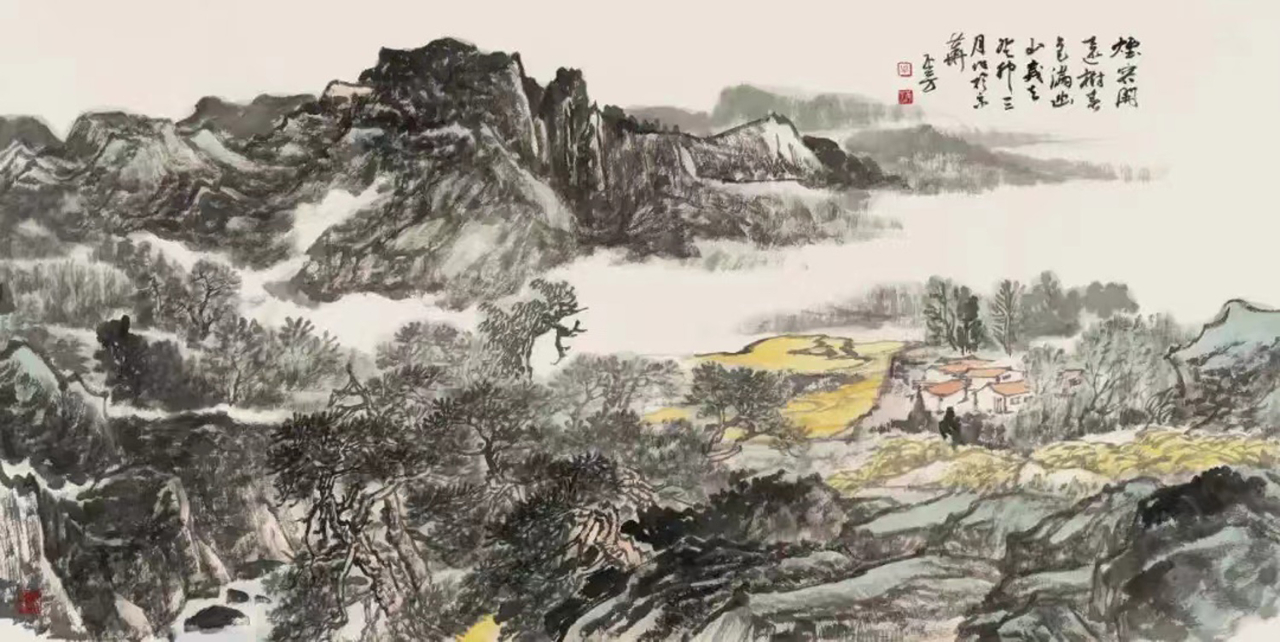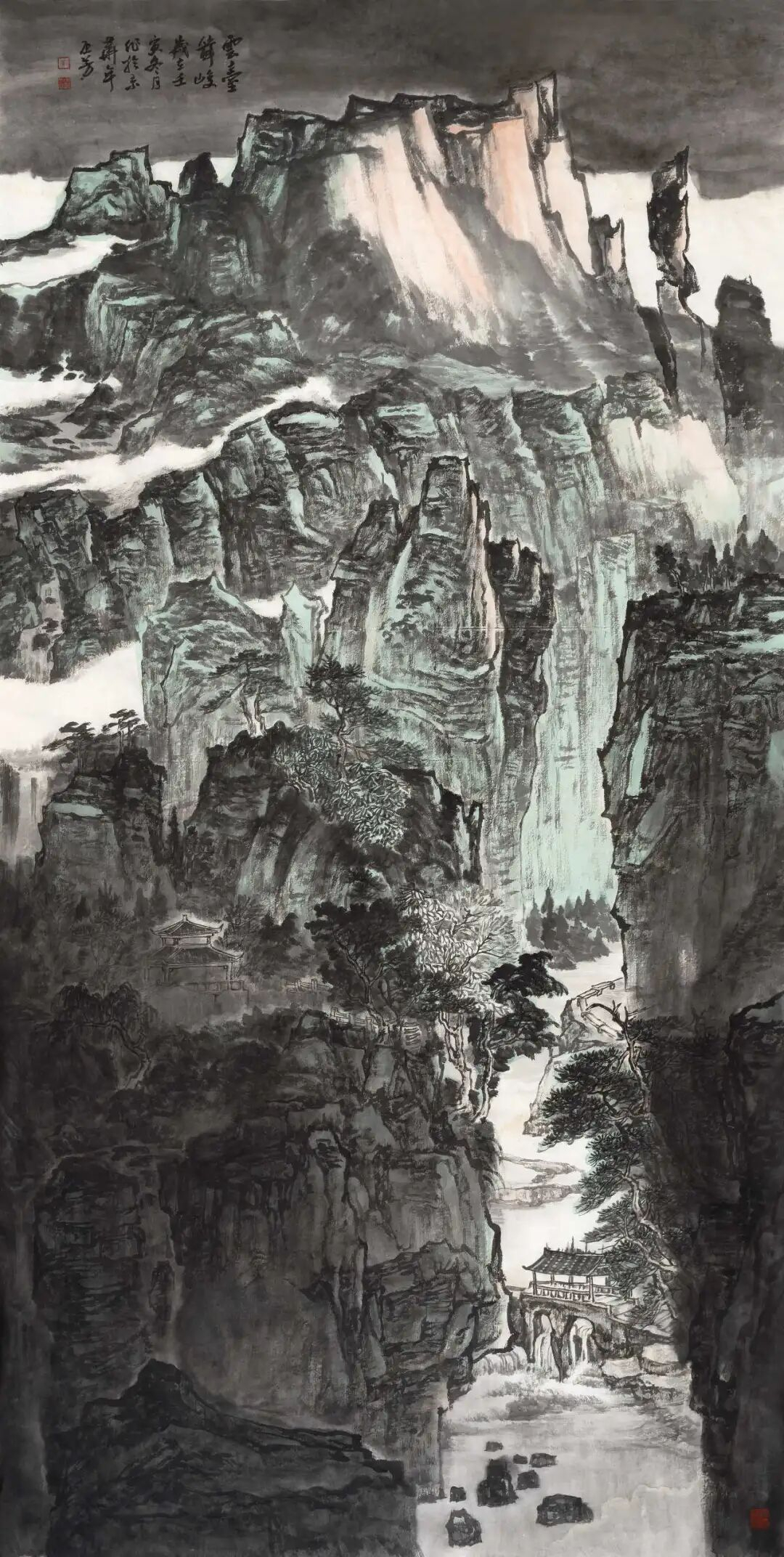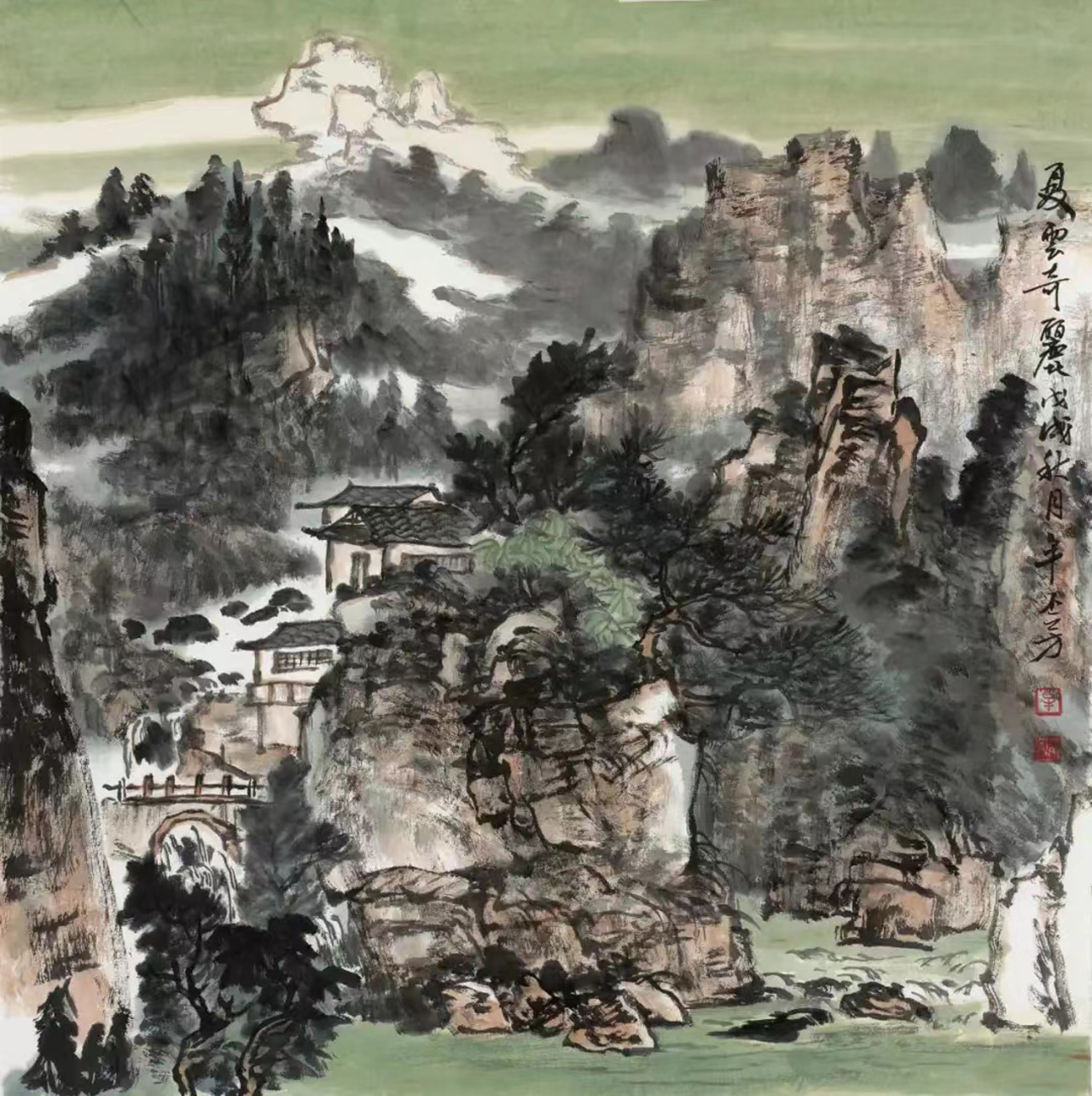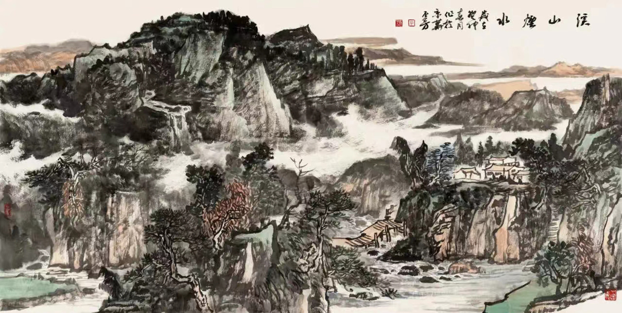 這便是他技法的高明:不止于“畫(huà)山是山”的工致,更在于“畫(huà)山是詩(shī)”的深情。他的山水里,有“巍巍聳立天”的壯闊,像松濤漫過(guò)山巔;有“溪水緩緩流”的清悠,像月光漫過(guò)琴弦;有“梵音空谷繞”的寂,像晨霧漫過(guò)寺檐;有“煙靄煙云飄”的柔,像柳絲纏著春風(fēng)——難怪人民大會(huì)堂的壁間、外交協(xié)會(huì)的案頭都藏著他的作品:那不是裝飾的景,是可以揣在懷里的山河,是可以寄給故鄉(xiāng)的信,像月光漫進(jìn)酒盞,像晨霧漫過(guò)山崗。