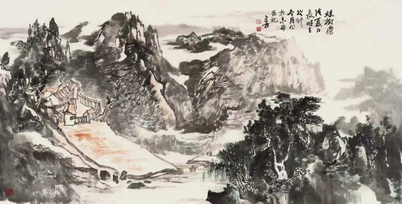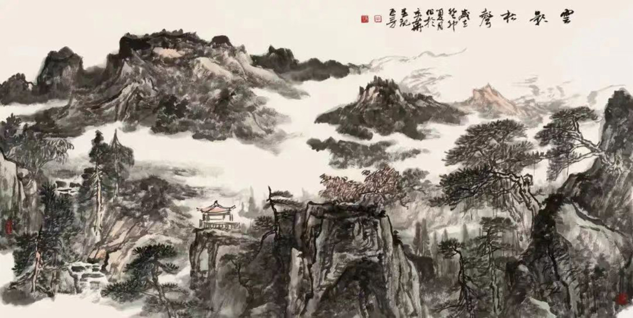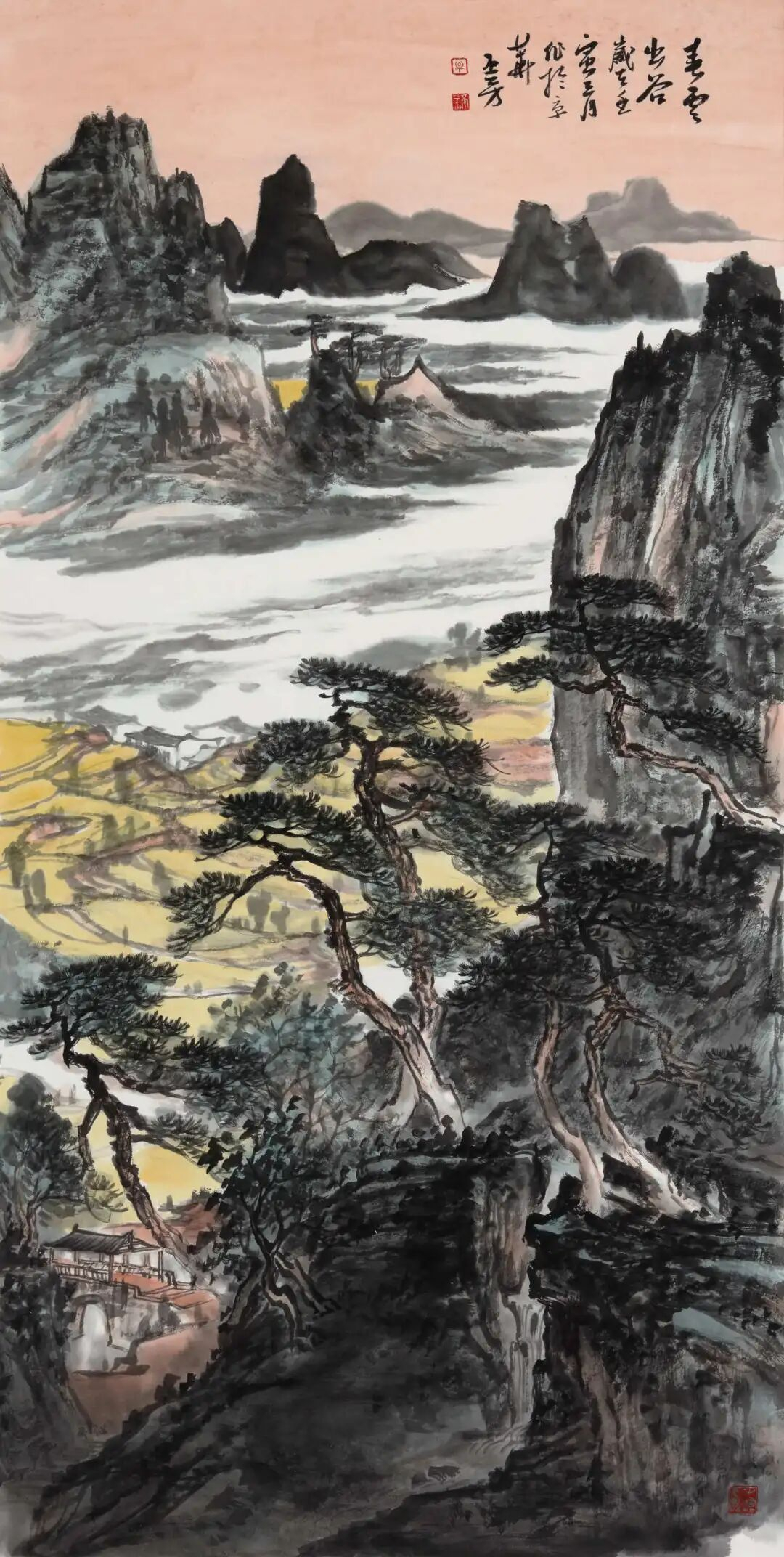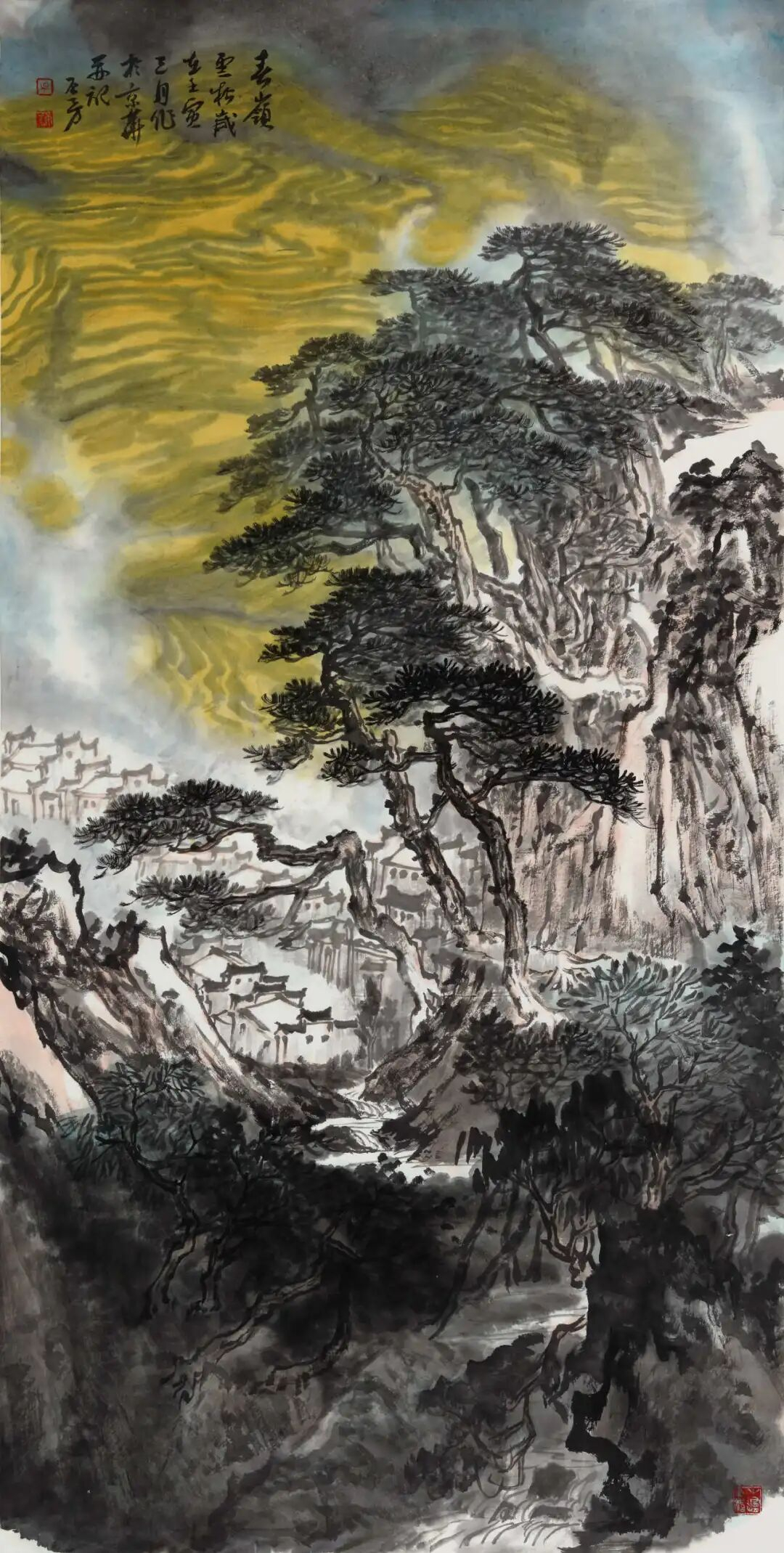 這便是他技法的高明:不止于“畫(huà)山是山”的工致,更在于“畫(huà)山是詩(shī)”的深情。他的山水里,有“巍巍聳立天”的壯闊,像松濤漫過(guò)山巔;有“溪水緩緩流”的清悠,像月光漫過(guò)琴弦;有“梵音空谷繞”的寂,像晨霧漫過(guò)寺檐;有“煙靄煙云飄”的柔,像柳絲纏著春風(fēng)——難怪人民大會(huì)堂的壁間、外交協(xié)會(huì)的案頭都藏著他的作品:那不是裝飾的景,是可以揣在懷里的山河,是可以寄給故鄉(xiāng)的信,像月光漫進(jìn)酒盞,像晨霧漫過(guò)山崗。