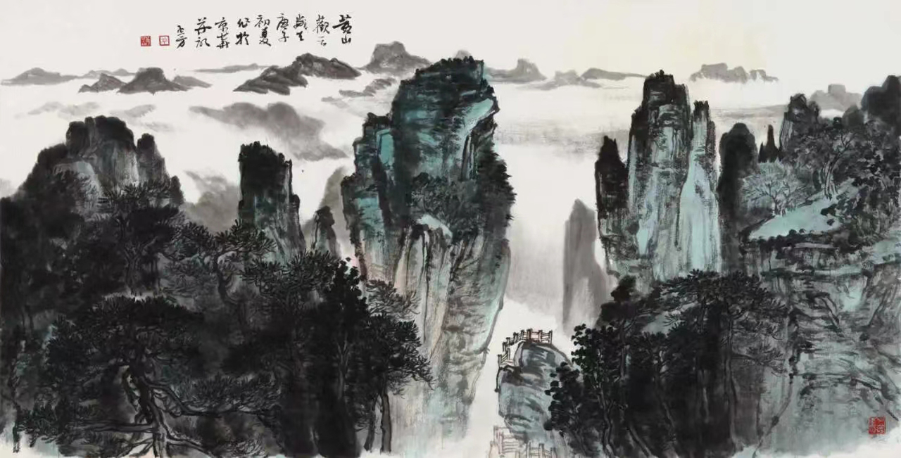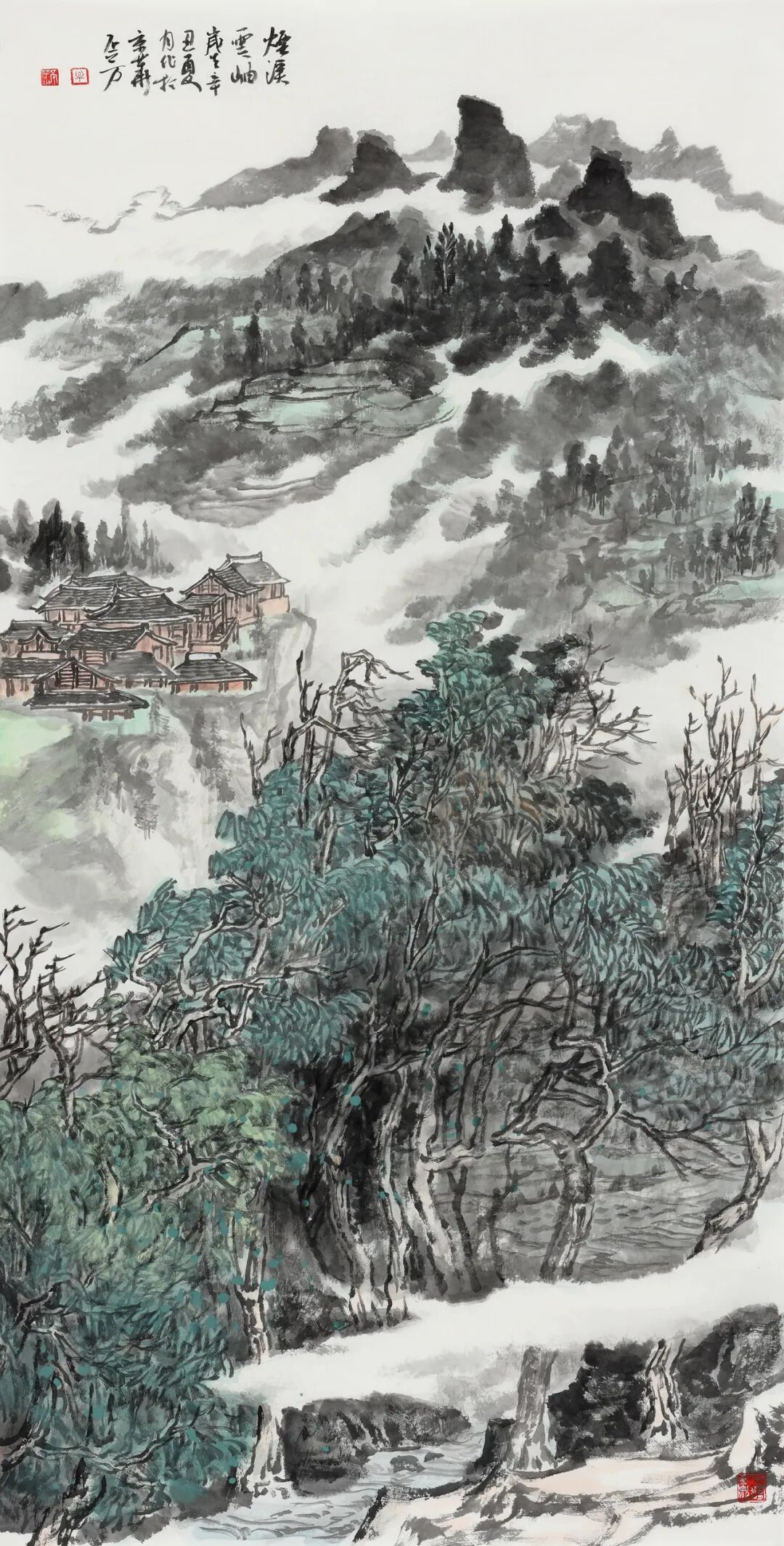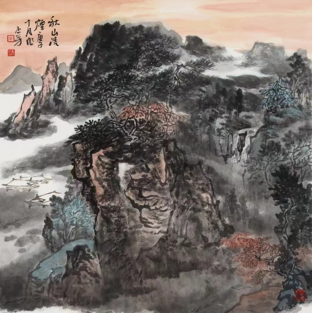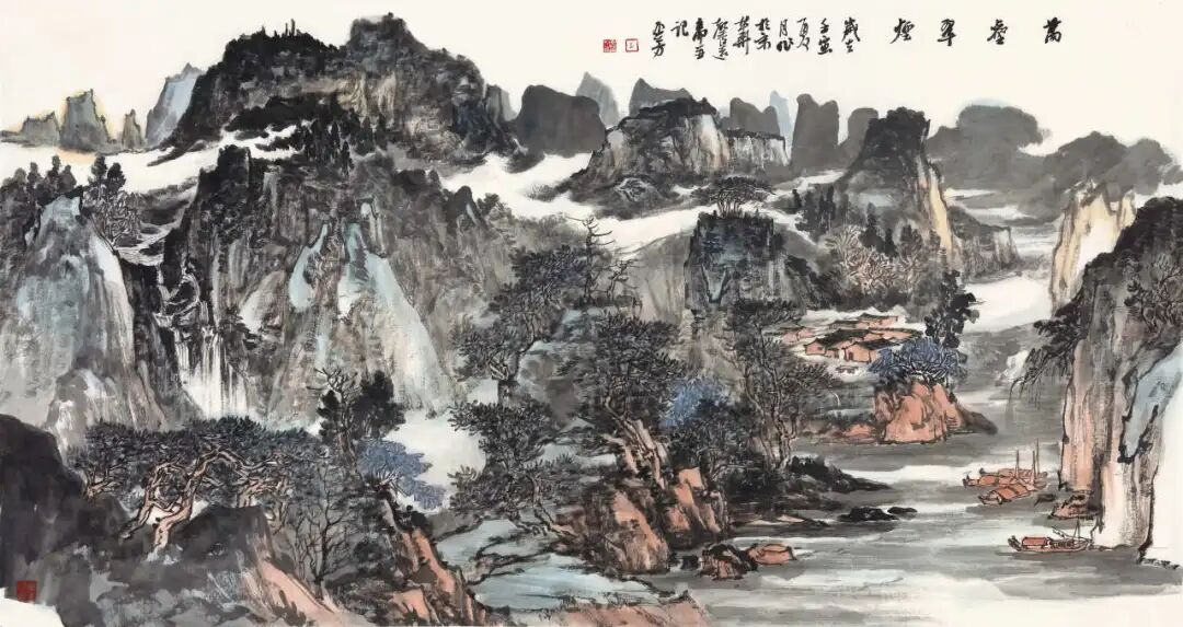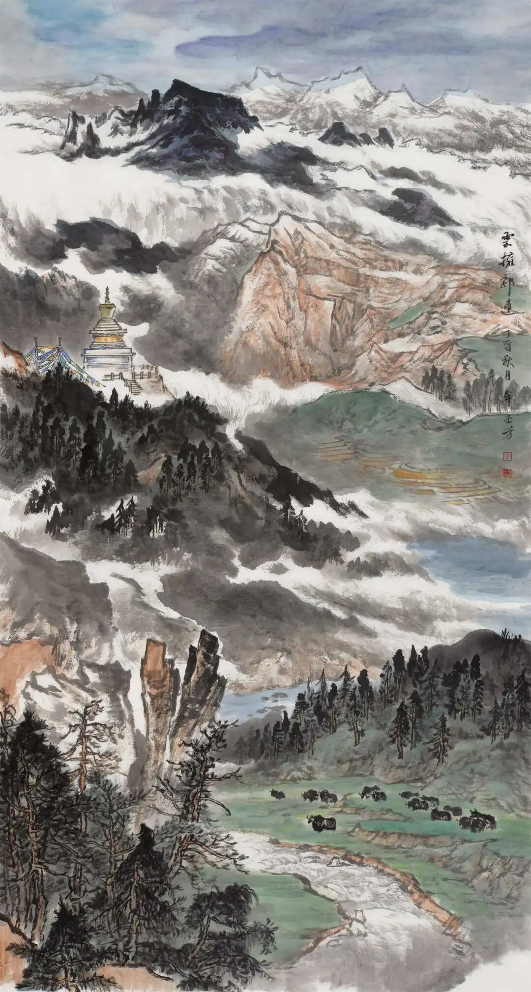 這便是他技法的高明:不止于“畫(huà)山是山”的工致,更在于“畫(huà)山是詩(shī)”的深情。他的山水里,有“巍巍聳立天”的壯闊,像松濤漫過(guò)山巔;有“溪水緩緩流”的清悠,像月光漫過(guò)琴弦;有“梵音空谷繞”的寂,像晨霧漫過(guò)寺檐;有“煙靄煙云飄”的柔,像柳絲纏著春風(fēng)——難怪人民大會(huì)堂的壁間、外交協(xié)會(huì)的案頭都藏著他的作品:那不是裝飾的景,是可以揣在懷里的山河,是可以寄給故鄉(xiāng)的信,像月光漫進(jìn)酒盞,像晨霧漫過(guò)山崗。