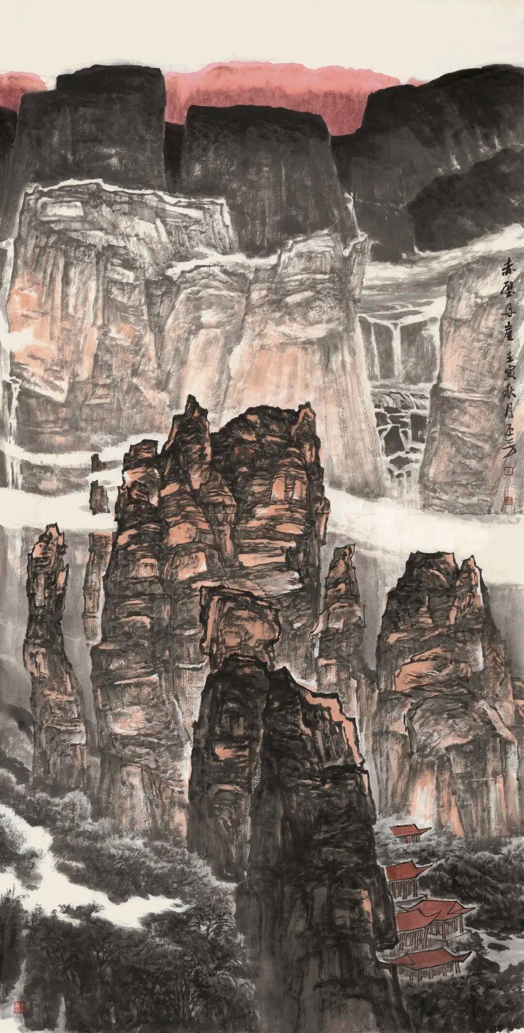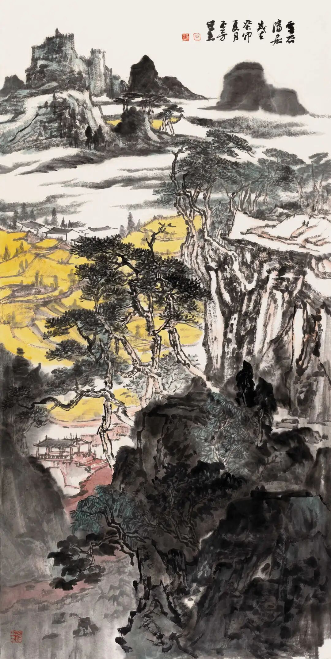 他的彩從不是喧賓的客,是墨里的溫柔痣。《萬(wàn)山紅遍》里,朱砂暈染的葉是秋陽(yáng)烤紅的山尖,裹著瀑布的白、屋舍的素,像歲月釀出的酒,又似楓葉浸著晨露;黃底崖壁上,赭色是夕照潑下的金,浸著墨色的冷,釀成“蒼山沐晚”的醉,又似麥浪染著夕陽(yáng)。他懂“淡”的真意——彩是墨的呼吸,不是妝的濃艷,一點(diǎn)紅、一抹黃,便讓山河有了春的柔、秋的暖,像花瓣沾著晨露,像星光漫過(guò)夜海。