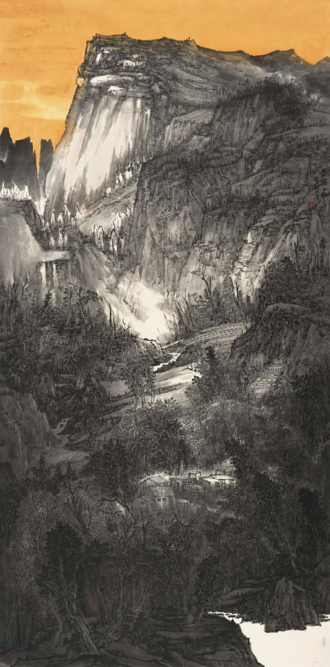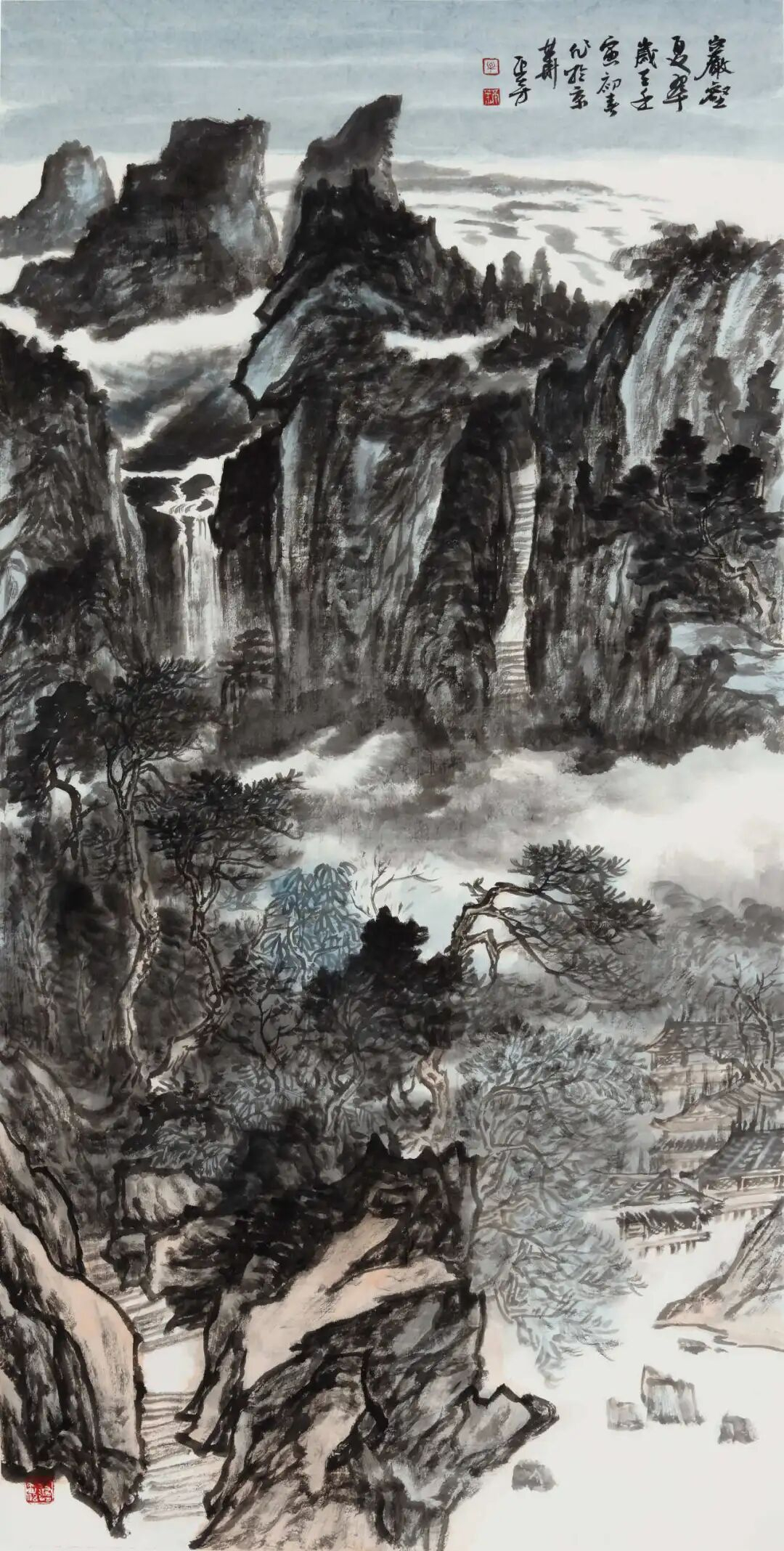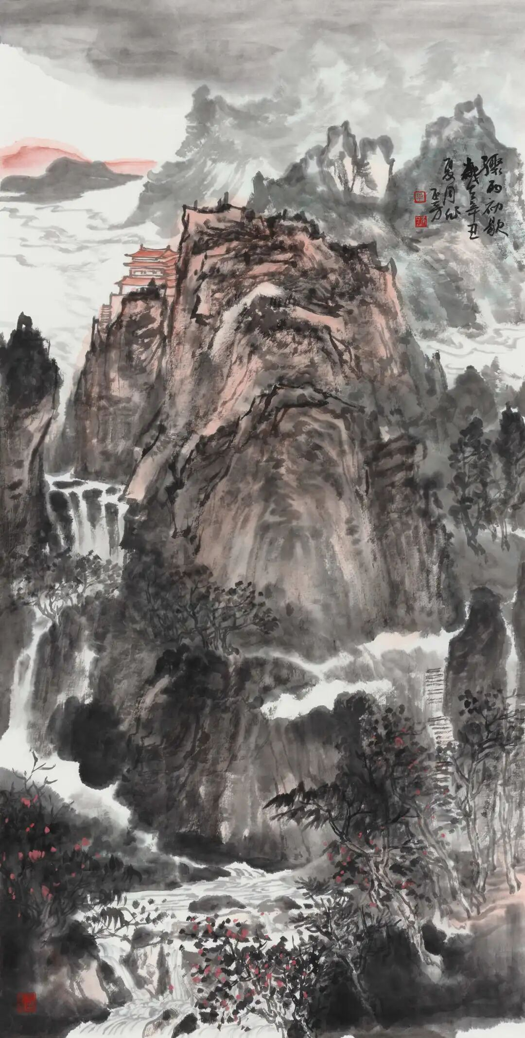 自魯迅美院筆墨筑基,至中國(guó)國(guó)家畫(huà)院意韻深耕,他的筆端攢著傳統(tǒng)與新境的和鳴,如春溪匯入江海。他的墨是山河的裁衣針:斧劈皴刻就的崖壁如鐵鑄的骨,筆鋒飛白是歲月裂出的紋;披麻皴暈開(kāi)的肌理似青苔裹著的暖,積墨層疊是云氣浸透的柔。你看那危崖——濃墨是它的脊梁,挺如松立;淡墨是它的呼吸,輕似云游;石縫里的林木都帶著筆鋒的勁,像劍鋒挑開(kāi)晨霧,像琴弦撥動(dòng)松風(fēng)——他把“壁立千仞”的雄與“苔痕上階”的柔,縫進(jìn)同一方宣紙,讓山既有風(fēng)骨,又有溫度,像春風(fēng)揉進(jìn)霜雪,像月光漫過(guò)檐角。