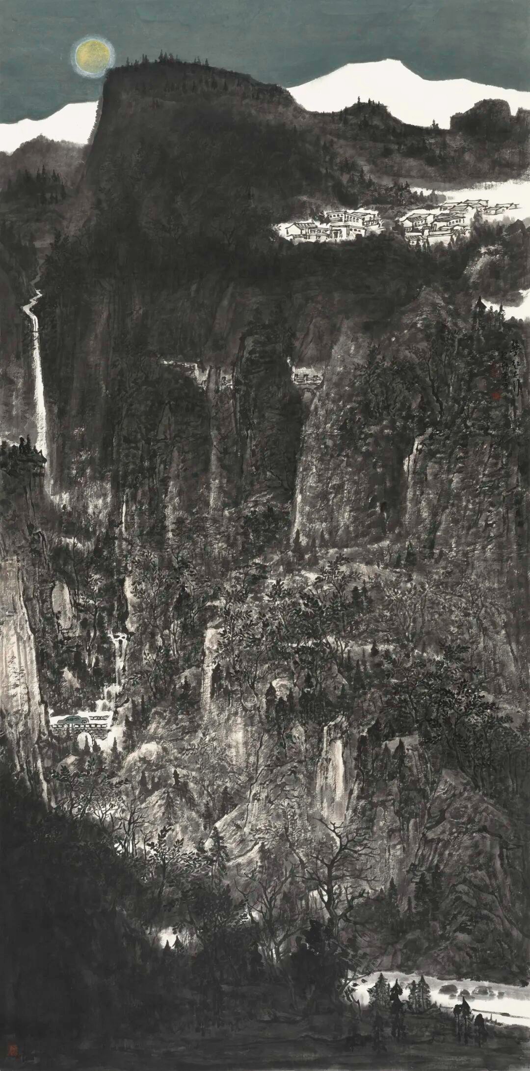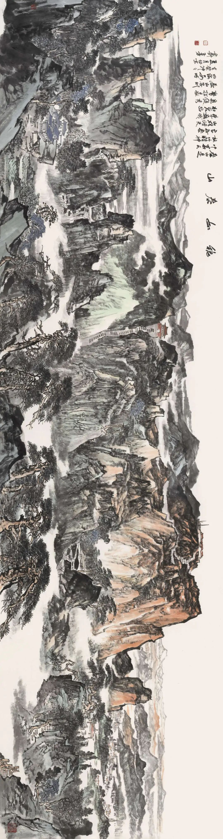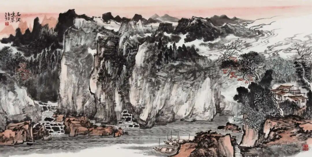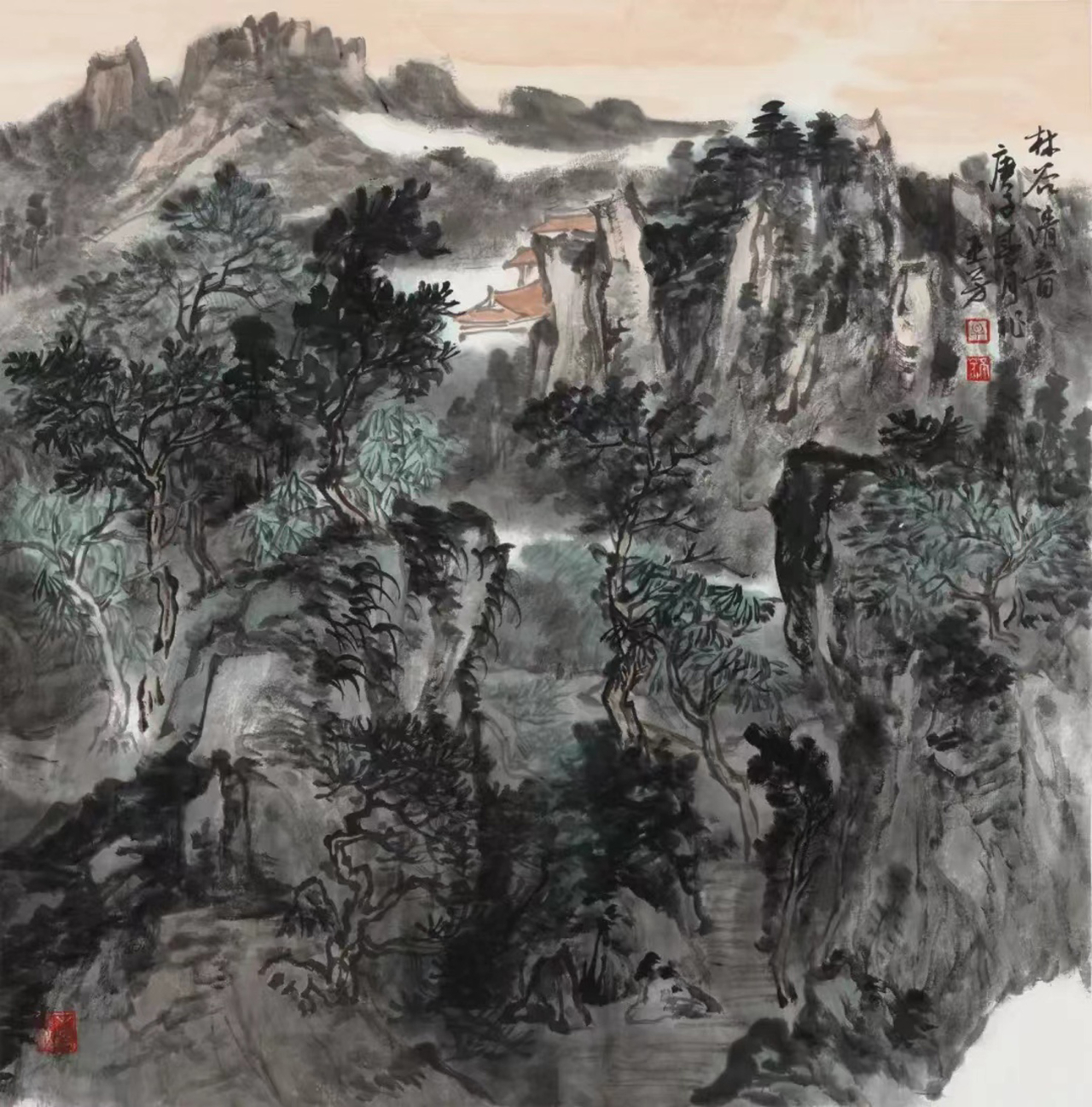 自魯迅美院筆墨筑基,至中國(guó)國(guó)家畫(huà)院意韻深耕,他的筆端攢著傳統(tǒng)與新境的和鳴,如春溪匯入江海。他的墨是山河的裁衣針:斧劈皴刻就的崖壁如鐵鑄的骨,筆鋒飛白是歲月裂出的紋;披麻皴暈開(kāi)的肌理似青苔裹著的暖,積墨層疊是云氣浸透的柔。你看那危崖——濃墨是它的脊梁,挺如松立;淡墨是它的呼吸,輕似云游;石縫里的林木都帶著筆鋒的勁,像劍鋒挑開(kāi)晨霧,像琴弦撥動(dòng)松風(fēng)——他把“壁立千仞”的雄與“苔痕上階”的柔,縫進(jìn)同一方宣紙,讓山既有風(fēng)骨,又有溫度,像春風(fēng)揉進(jìn)霜雪,像月光漫過(guò)檐角。