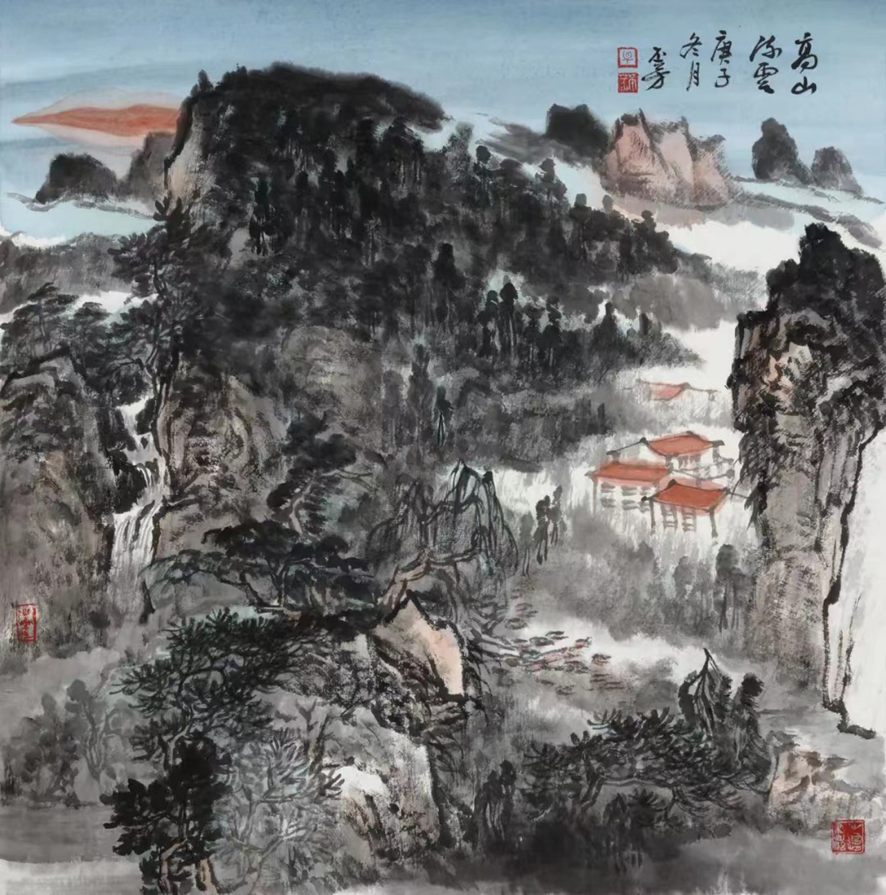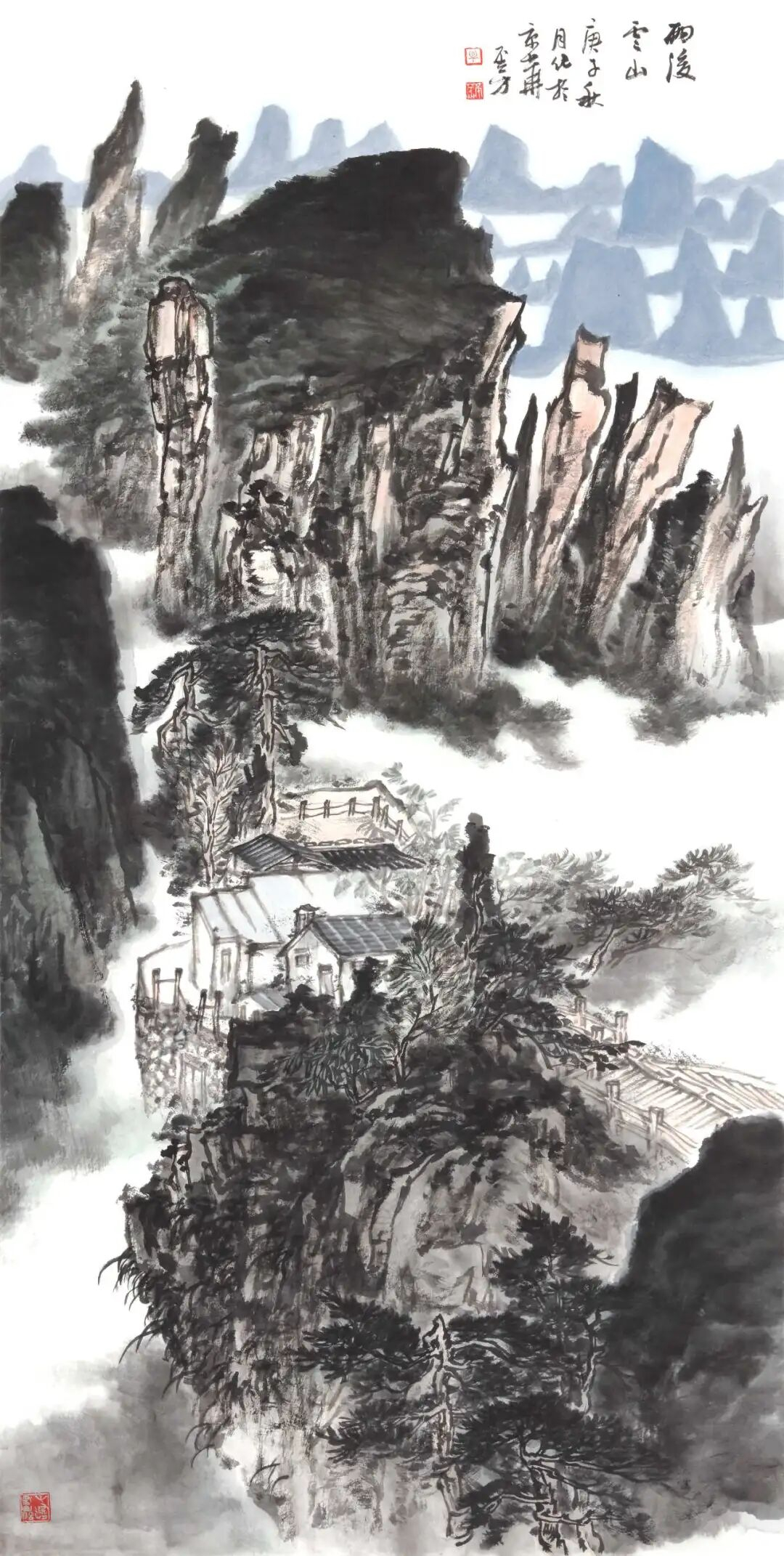 云霧是他畫(huà)里的呼吸,是墨色里的留白詩(shī)。淡如紗的晨霧纏著屋舍的檐角,像情思繞著琴弦;濃如煙的暮靄裹著林木的梢頭,像相思漫過(guò)窗欞;有時(shí)是云海里漏出的峰尖,像硯臺(tái)里浮著的墨塊,又似星子墜入夜海;有時(shí)是山腰間繞著的流嵐,像素帛上暈開(kāi)的水痕,又似蝶翼掠過(guò)花間。而那紅頂?shù)奈荨Ⅶ焱叩纳幔窃茲锊粗闹邸髅魇撬那搴磉@一抹暖艷,像山風(fēng)裹著灶火的香,像月光漫過(guò)酒盞,讓高遠(yuǎn)的山河落了地,讓清冷的畫(huà)境生了溫,像春雪融進(jìn)春泥,像秋露沾上菊蕊。