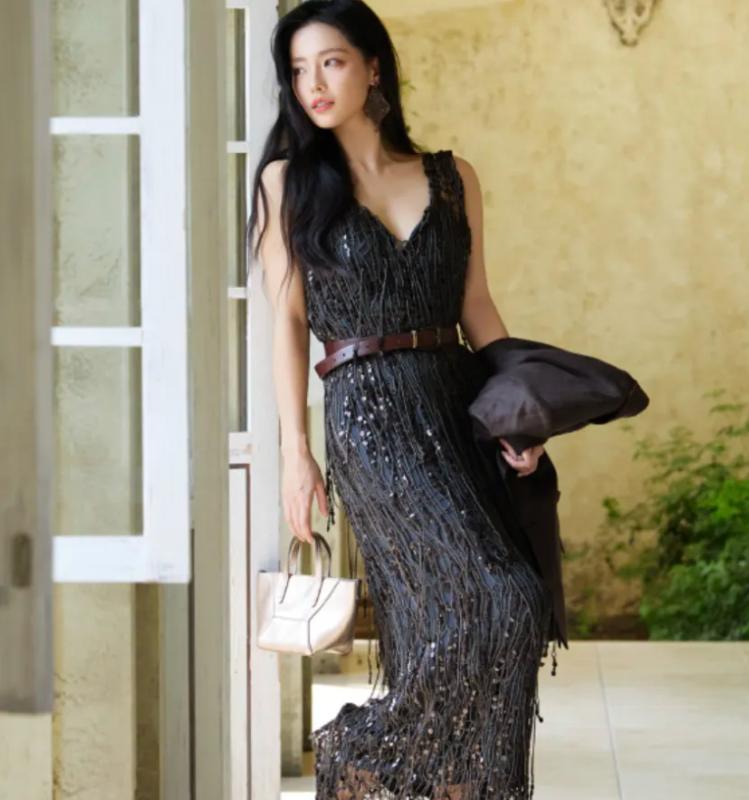 身穿黑色西裝長裙,穩穩站在 C 位。