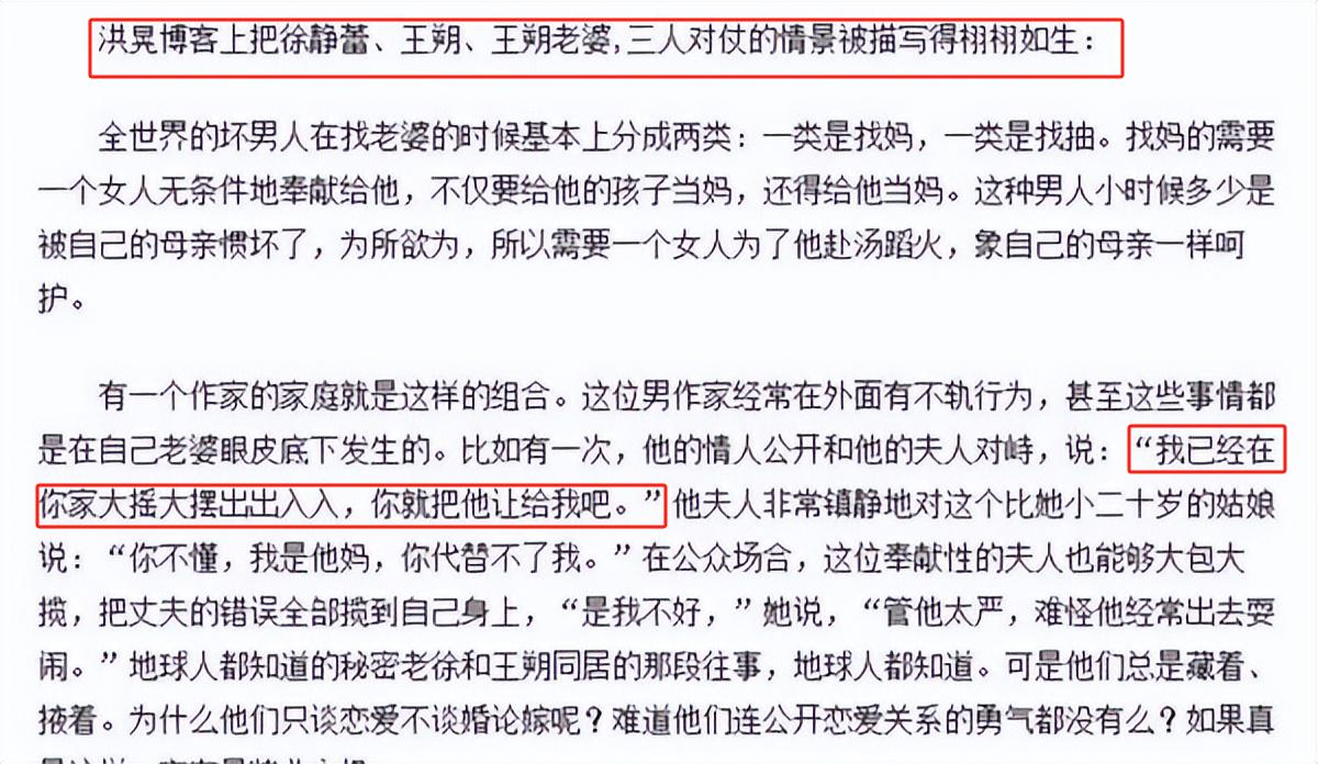 這是洪晃當年在博客上爆出王朔離婚時的猛料,一個“三姐”在原配家門公然挑釁。