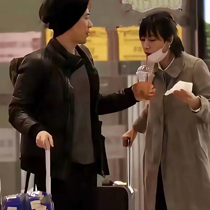 她帶著口罩,右手拿著行李箱,左手拿著紙巾,應該正在吃東西,站在一邊的男友手拿飲料喂給她喝。