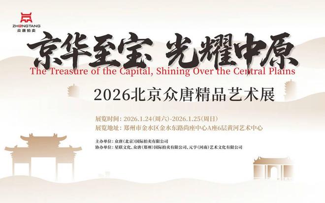 近日,北京眾唐拍賣有限公司正式宣布,將于2026年1月在河南省鄭州市舉辦“京華至寶 光耀中原——北京眾唐精品藝術展”,并同步啟動面向全國的藏品征集工作。本次活動由眾唐(北京)國際拍賣有限公司主辦,星聯(lián)文化、眾唐(鄭州)國際拍賣有限公司、元亨(河南)藝術文化有限公司共同協(xié)辦。旨在搭建高水準的藝術交流平臺,匯聚京城與中原的文化精粹,推動現(xiàn)當代藝術與傳統(tǒng)收藏品的市場互動。