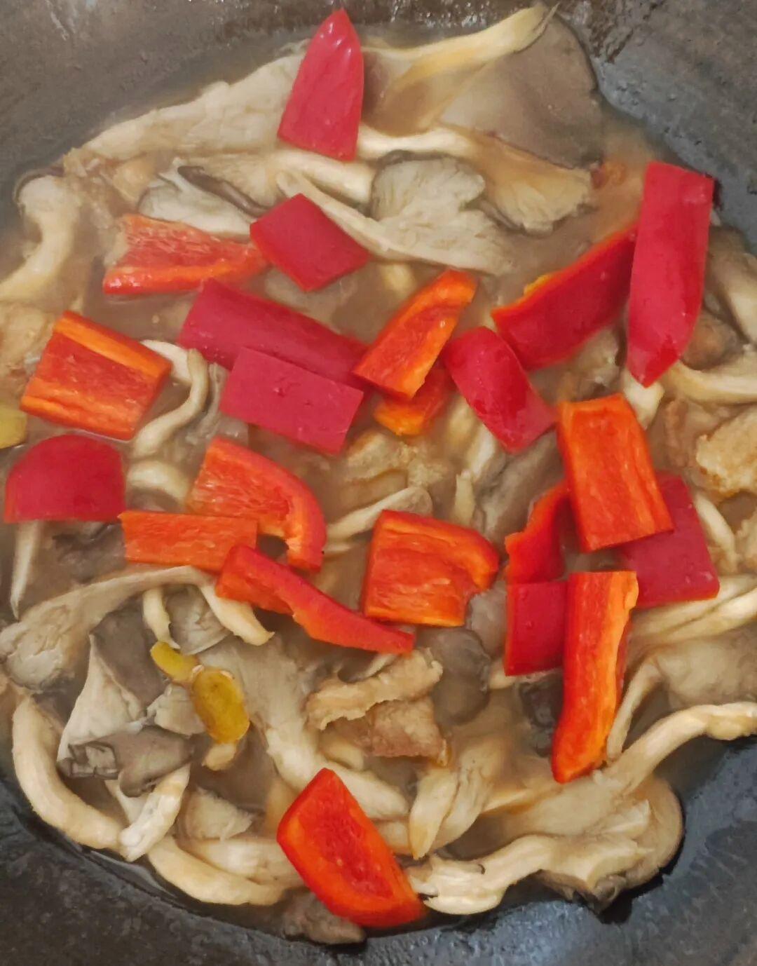放入紅甜椒,加1勺料酒、2勺生抽,快速翻炒均勻,讓每片平菇和肉片都裹上醬汁,最后根據口味加少許鹽調味,翻炒10秒即可出鍋。
