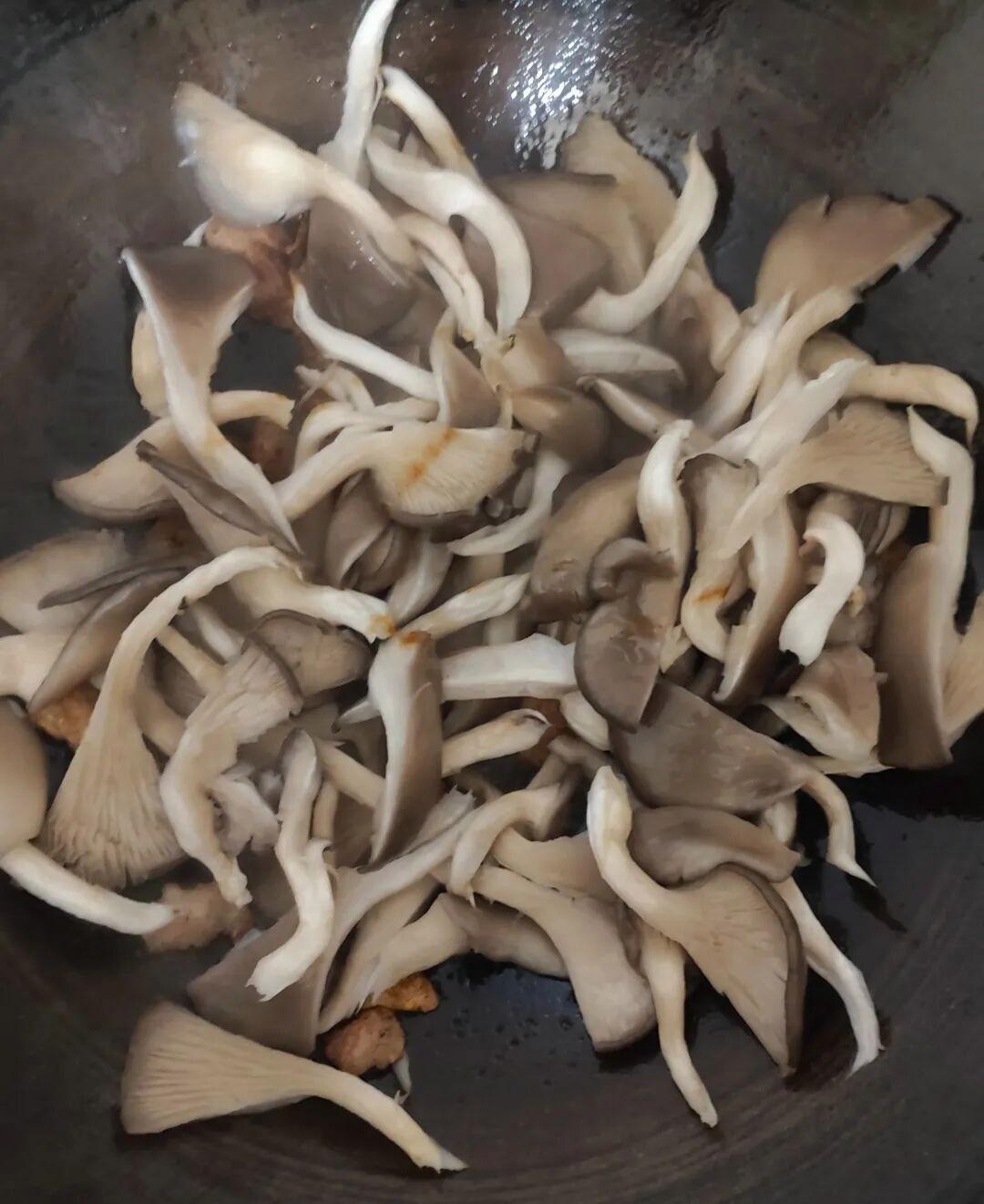 倒入擠干水分的平菇,大火快速翻炒,直到平菇變軟、出水后再繼續炒1分鐘,把水分收至半干。