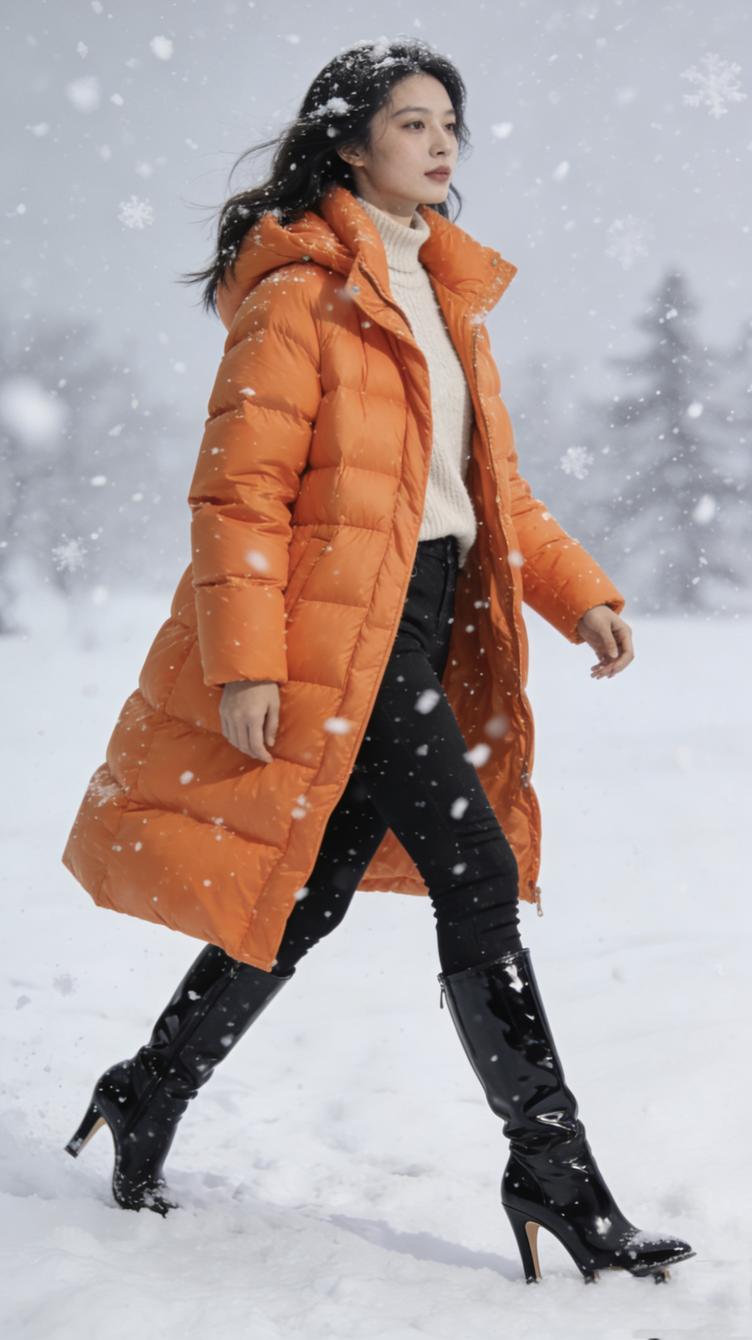 當皚皚白雪將世界暈染成單調的灰白,一抹亮橙的羽絨服劃破沉寂,成為冬日里最鮮活的注腳。在冰雪覆蓋的曠野中,橙色長款羽絨服與雪地的碰撞,不僅是視覺上的驚艷,更是穿搭中“生命力”與“實用性”的完美融合。這抹躍動的橙,既是對抗冬日沉悶的勇氣,也是解鎖冬日時尚的密鑰。