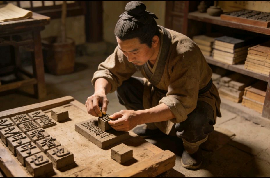 北宋慶歷年間的杭州書坊,畢昇蹲在地上,手里捏著塊膠泥,指尖在上面細細刻著字。案上擺著一堆刻好的泥塊,有“之”“乎”“者”“也”,還有些常用的姓氏,像小豆腐塊似的碼得整整齊齊。
