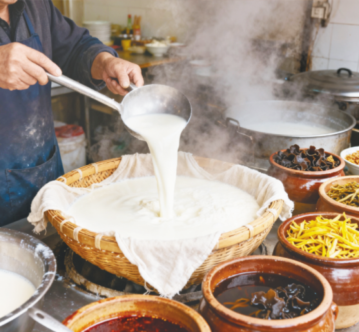 豆腐腦在豆制品中是一種特別的存在,它介于豆腐與豆漿之間,既不像豆腐那般可以成棱角分明地被切割,也不似豆漿如水一般可以肆意流動。一般情況下,人們都會說吃豆腐,喝豆漿,神奇的是與豆腐腦完美匹配的動詞也是“喝”。其實,在豆腐與豆腐腦之間還有一種更特別的存在,就是老豆腐。與老豆腐能夠合理搭配的動詞,就是“吃”。豆腐腦與老豆腐二者雖形狀相似,但口感差別卻很大:豆腐腦嫩得可以掐出水來,老豆腐質地更加堅實。