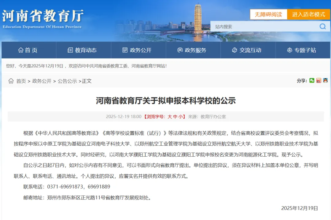 根據(jù)《中華人民共和國高等教育法》《高等學校設置標準(試行)》等法律法規(guī)和有關(guān)政策規(guī)定,結(jié)合省高校設置評議委員會考察情況,擬按程序申報以中原工學院為基礎(chǔ)設立河南電子科技大學、以鄭州航空工業(yè)管理學院為基礎(chǔ)設立鄭州航空航天大學、以鄭州鐵路職業(yè)技術(shù)學院為基礎(chǔ)設立鄭州鐵路職業(yè)技術(shù)大學。同時經(jīng)研究,以河南大學濮陽工學院為基礎(chǔ)設立濮陽工學院申報校名變更為河南能源化工學院。現(xiàn)予公示。
