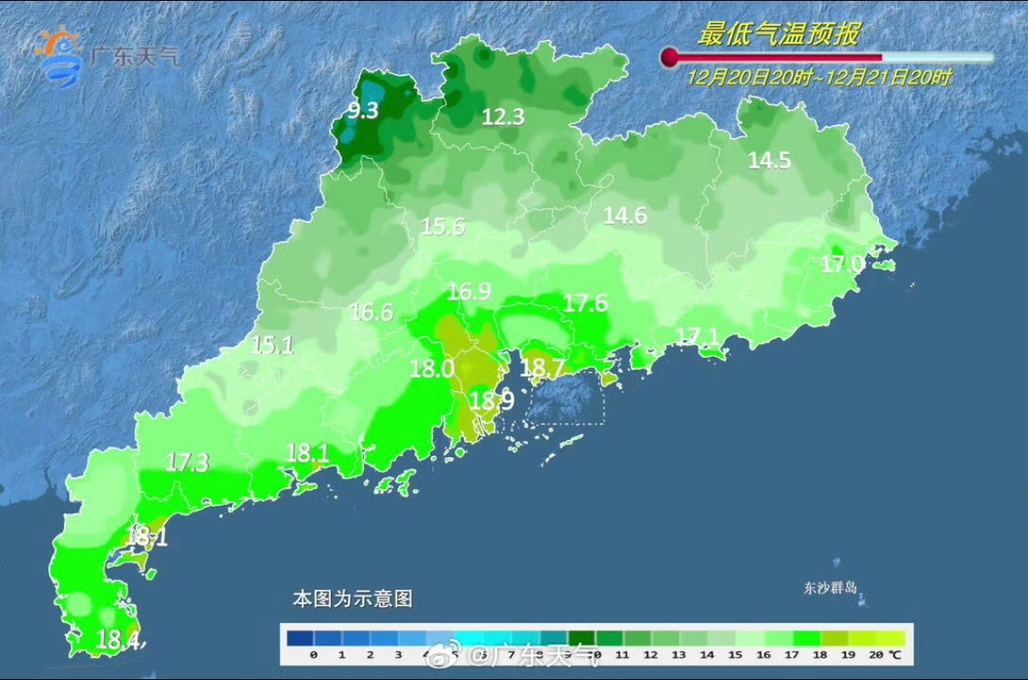 具體來(lái)看,20日我省大部多云間晴,局部有小雨。最低氣溫:粵北大部、肇慶、云浮11℃—15℃,其余市縣16℃—20℃。