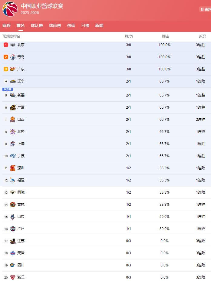 CBA打到現在,保持全勝的隊伍還有3支,分別是3勝0負的青島,3勝0負的北京隊,還有3勝0負的廣東隊,3隊戰績相同,凈勝分有差距,展開了第1的爭奪!