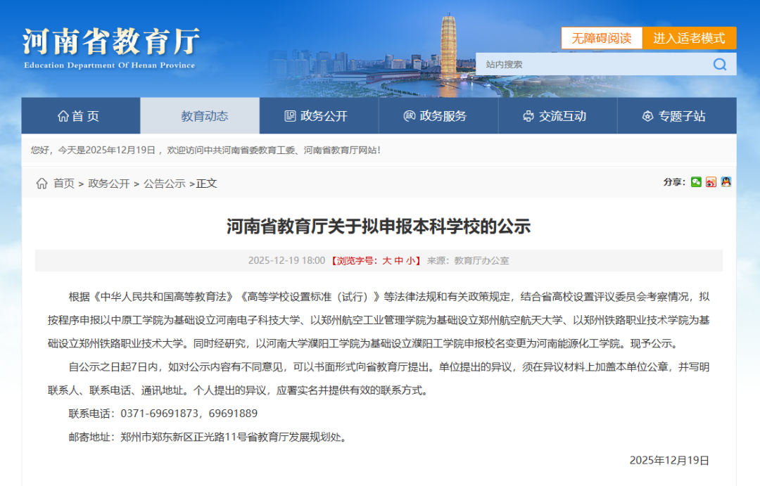 根據《中華人民共和國高等教育法》《高等學校設置標準(試行)》等法律法規和有關政策規定,結合省高校設置評議委員會考察情況,擬按程序申報以中原工學院為基礎設立河南電子科技大學、以鄭州航空工業管理學院為基礎設立鄭州航空航天大學、以鄭州鐵路職業技術學院為基礎設立鄭州鐵路職業技術大學。同時經研究,以河南大學濮陽工學院為基礎設立濮陽工學院申報校名變更為河南能源化工學院。現予公示。