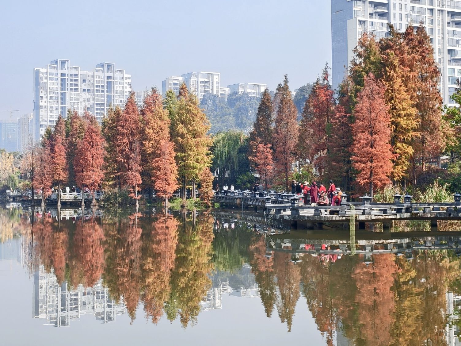這大概就是城市里最舒服的秋了:不用追遠山,不用趕晨霧,只要站在湖邊,看水杉把天、山、人都揉進一汪紅里,就懂了什么是“日子慢,秋光暖”。