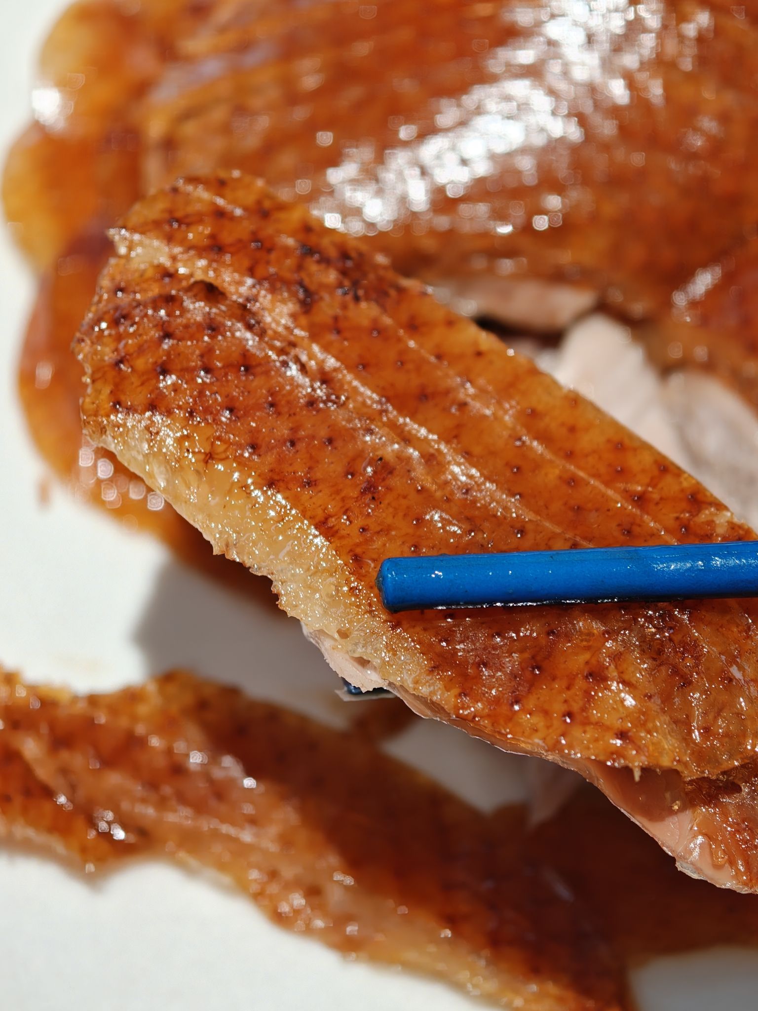 烤鴨幾乎是桌桌必點,烤制的手藝真是沒的說,鴨皮和肉之間的脂肪都烤成氣孔了,一口下去就是酥而不膩的口感,我個人更喜歡把贈送的小菜里的山楂條和鴨肉鴨皮黃瓜條胡蘿卜條卷在一起吃,這樣口感更豐富。