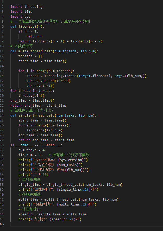 - 這段代碼很簡單:我們用斐波那契數列計算作為CPU密集型任務,分別測試單線程和多線程的執行時間。