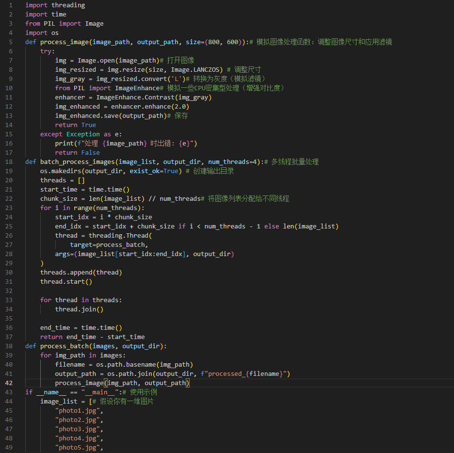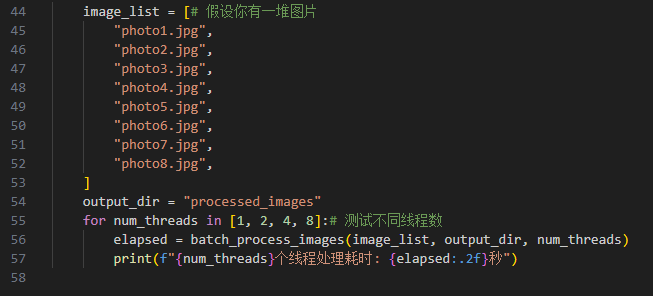- 這個例子更實用吧?你把自己的圖片路徑填進去,然后分別用1、2、4、8個線程跑一遍,對比一下性能。在自由線程模式下,你會看到線程數越多,處理速度越快(直到達到你的CPU核心數上限)。