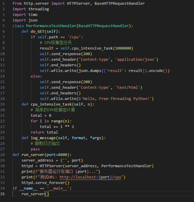 裝好之后,咱們來寫第一個自由線程程序。我們先寫一個傳統的多線程CPU密集型任務,對比一下GIL模式和自由線程模式的性能差異。