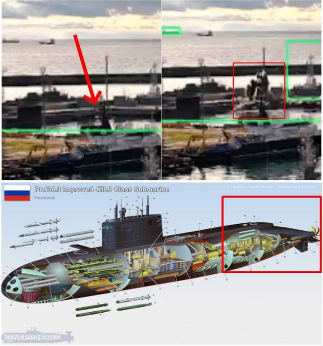 通過對烏方發布的襲擊視頻進行研判,雖然距離襲擊地點較遠,但依然能夠分辨出兩艘基洛級潛艇分別停泊在L型碼頭的兩端,爆炸地點位于疑似“華沙揚卡”號的艇尾,以及另一艘潛艇的艇艏位置,如果爆炸威力夠大的話,那么可能會擊傷兩艘潛艇的螺旋槳和艦艏聲吶系統,但是不會造成俄潛艇傾覆沉沒。