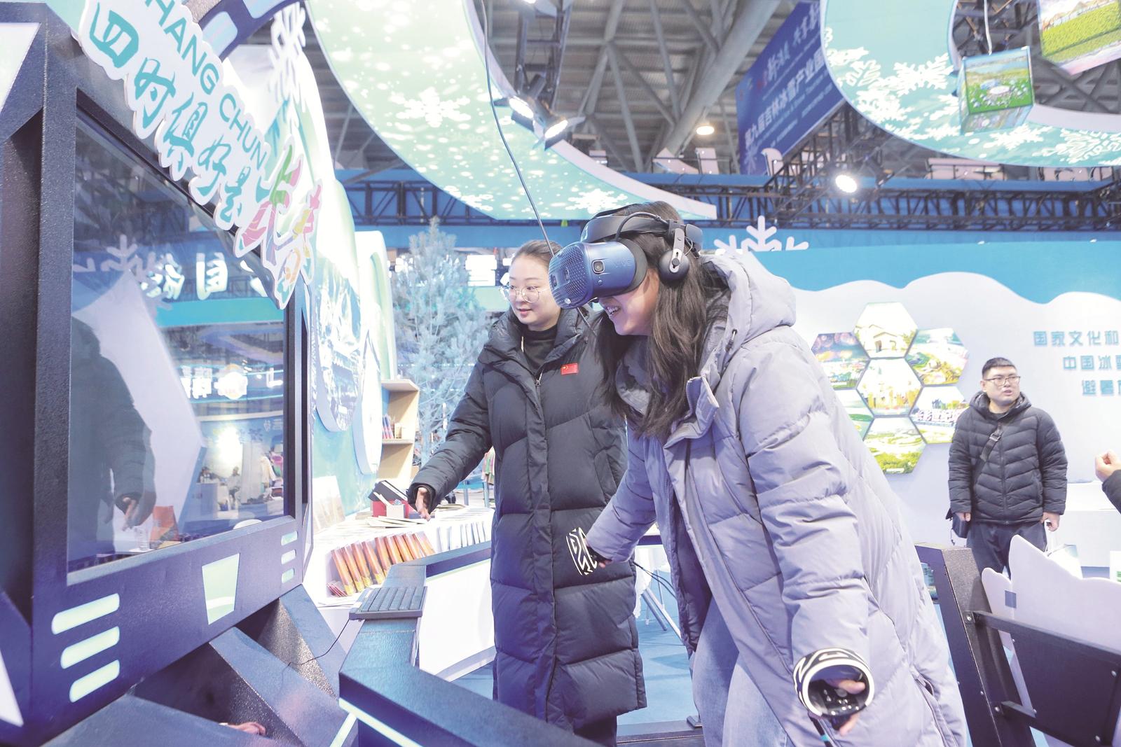 第九屆吉林雪博會現場,各類沉浸式冰雪體驗項目趣味拉滿,互動感與參與感十足。圖為游客在體驗VR模擬滑雪機。
