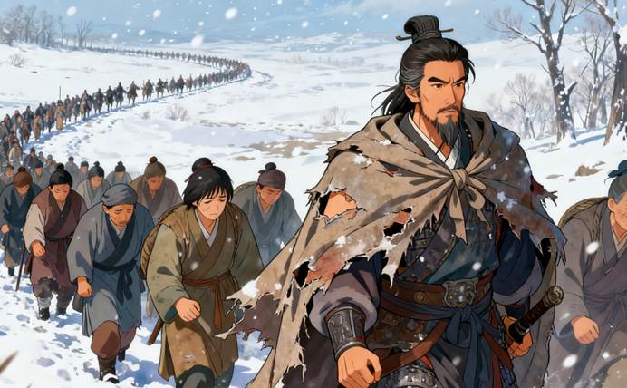 建安十三年的冬天,荊州新野城外,一支狼狽的隊(duì)伍在風(fēng)雪中艱難前行。四十七歲的劉備剛剛經(jīng)歷了當(dāng)陽(yáng)之?dāng)。f(wàn)百姓跟隨他逃難,日行僅十余里,被曹操的五千鐵騎在長(zhǎng)坂坡追上。士卒離散,百姓流離,連妻子甘夫人都一度失散。