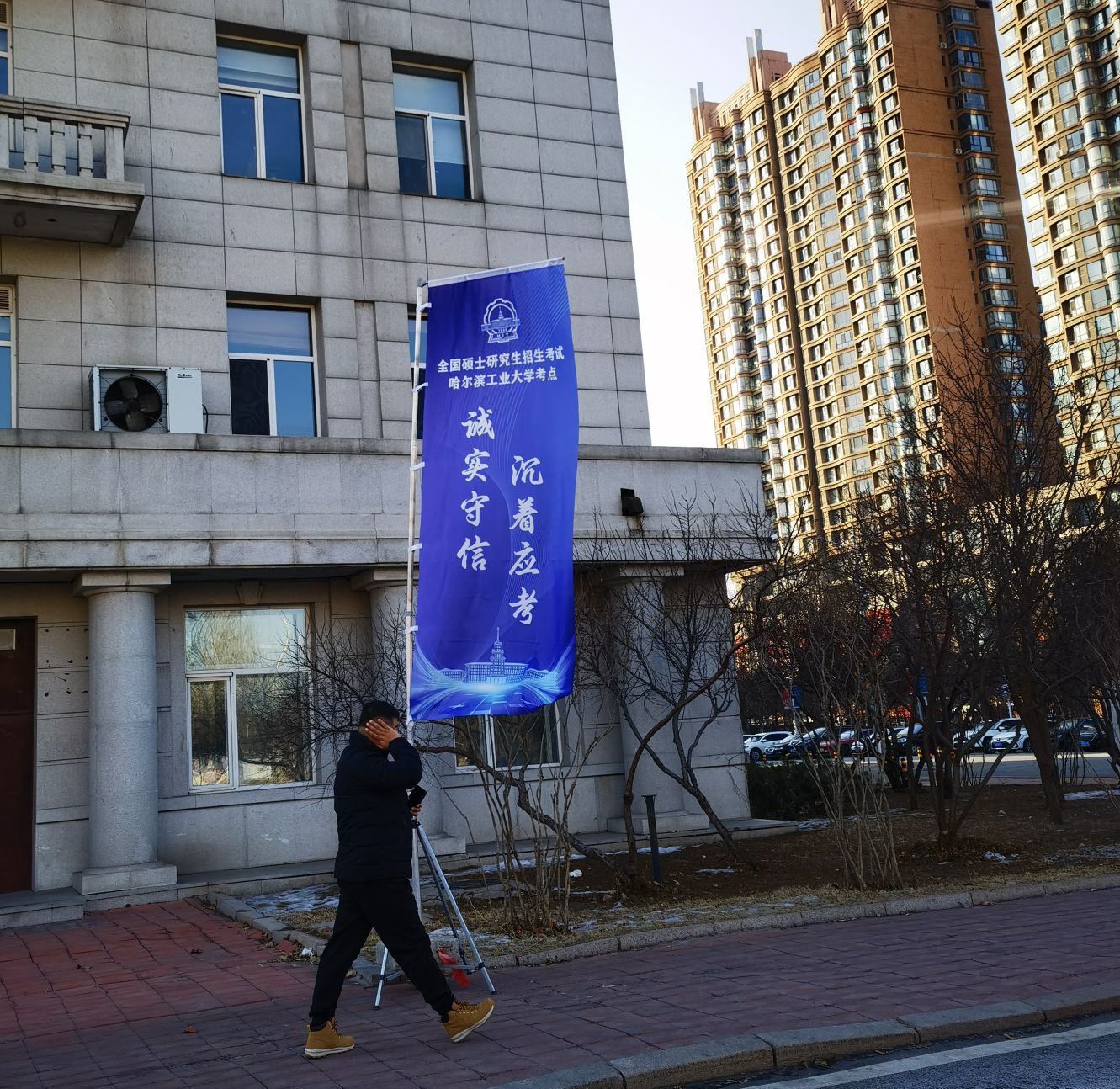 值勤保安非常嚴肅,不斷清理門前的閑散人員,原來,今天是全國碩士研究生考試。