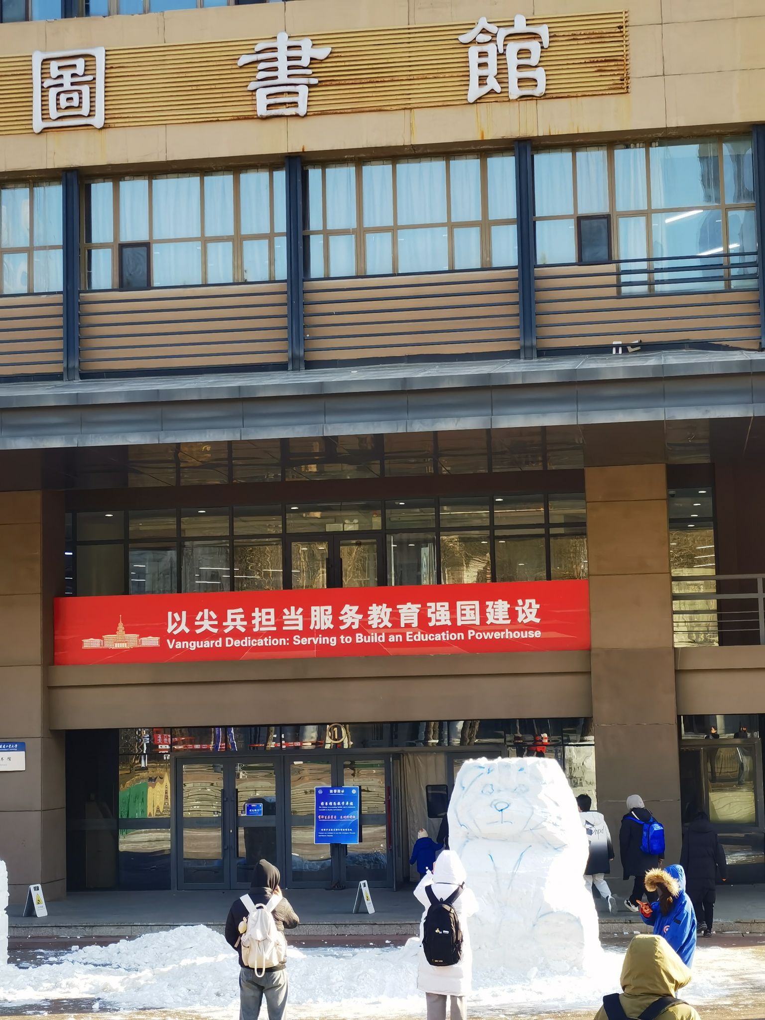 又到工大文創產品店逛逛,路過圖書館時,看到正在設計中的雪雕,乍一看像熊貓,仔細看應該是個威武的獅子。