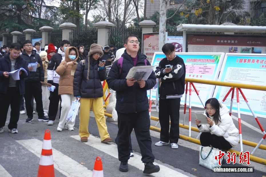 12月20日,待考考生在河南省鄭州中學初中部考點外復習。當日,2026年全國碩士研究生招生考試初試正式開考,此次考試報名人數為343萬,考試時間為12月20日至21日。