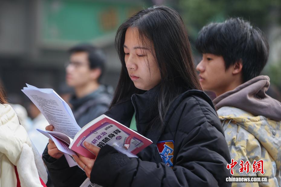 12月20日,江西南昌,考生在南昌中學民德路校區考點門口看書復習。當日,2026年全國碩士研究生招生考試初試正式開考,此次考試報名人數為343萬,考試時間為12月20日至21日。