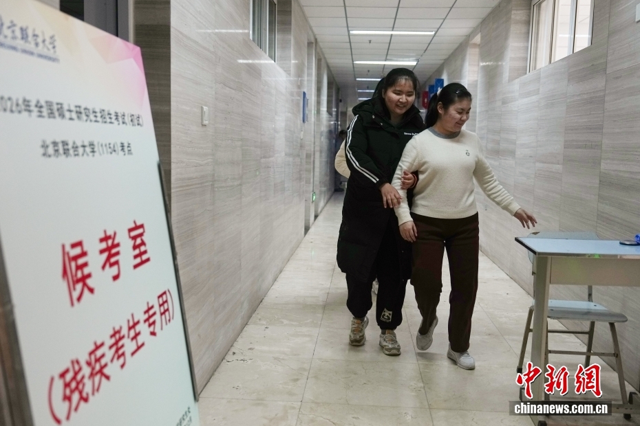 12月20日,2026年全國碩士研究生招生考試初試正式開考。在北京聯合大學考點,26名視障考生報名參加考試。據介紹,北京聯合大學設置了針對視障考生的專門安檢通道和殘疾考生專用候考室,安排志愿者提供幫助,并為視障考生提供免費午餐,為視障考生創造良好的考試環境。圖為兩名視障考生互相攙扶前往專用候考室。