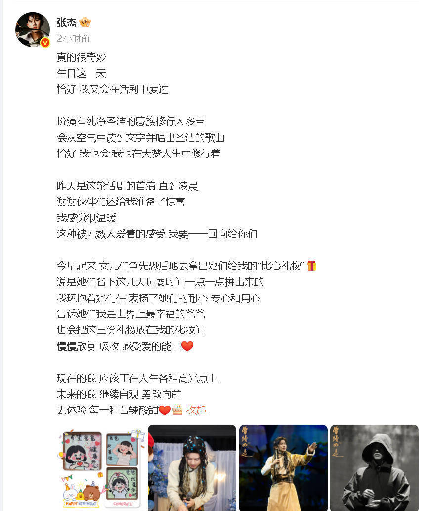 搜狐娛樂訊 20日,張杰在社交平臺上發文透露自己一早就收到了三個女兒送給他的生日禮物,還直言自己是世界上最幸福的爸爸!張杰表示:“今早起來,女兒們爭先恐后地去拿出她們給我的‘比心禮物’,說是她們省下這幾天玩耍時間一點一點拼出來的 ,我環抱著她們仨,表揚了她們的耐心、專心和用心,告訴她們我是世界上最幸福的爸爸,也會把這三份禮物放在我的化妝間,慢慢欣賞、吸收,感受愛的能量。”
