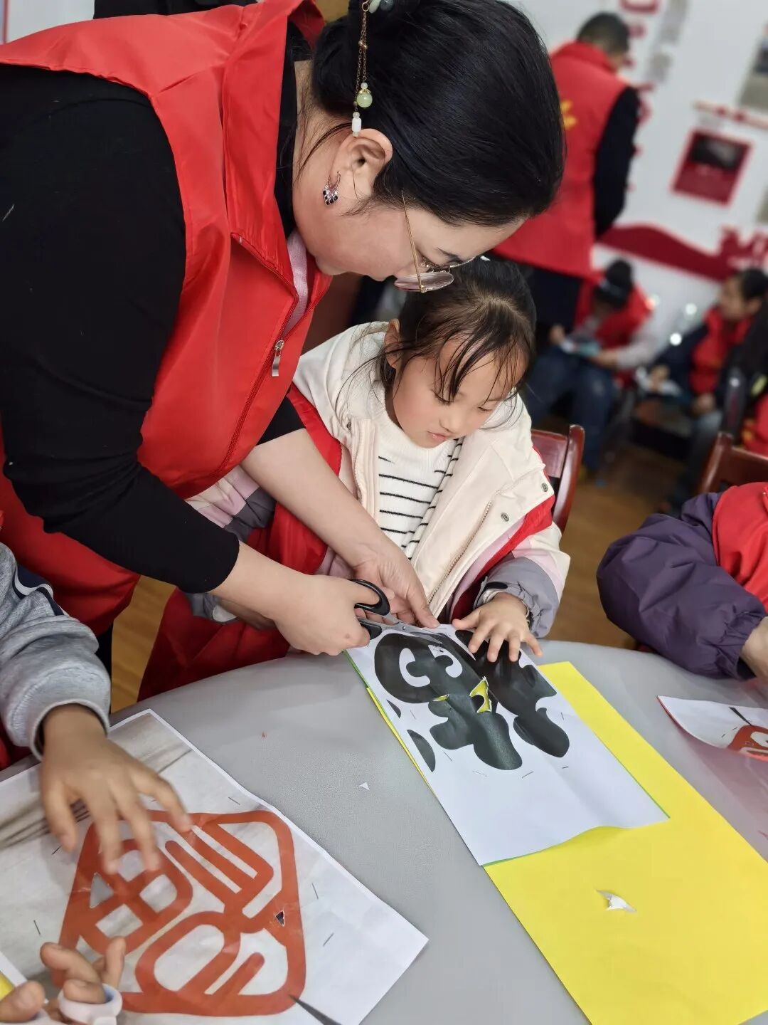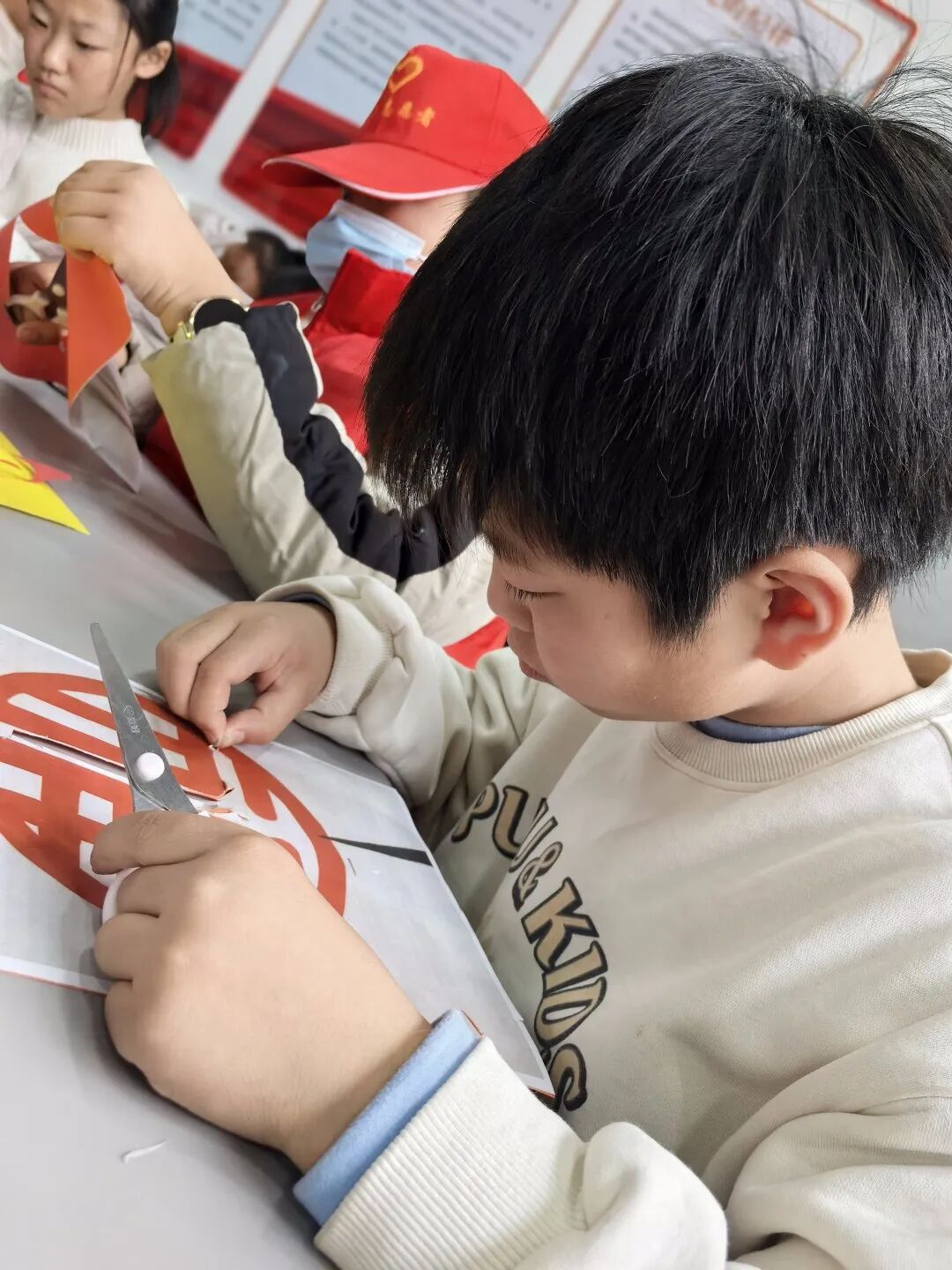剪紙活動(dòng)開始,志愿者們講述了冬至的文化內(nèi)涵與習(xí)俗并示范如何剪紙。孩子們選好自己心儀的圖案,仔細(xì)沿著步驟認(rèn)真操作,一幅幅生動(dòng)有趣的作品便在巧手中剪出。
