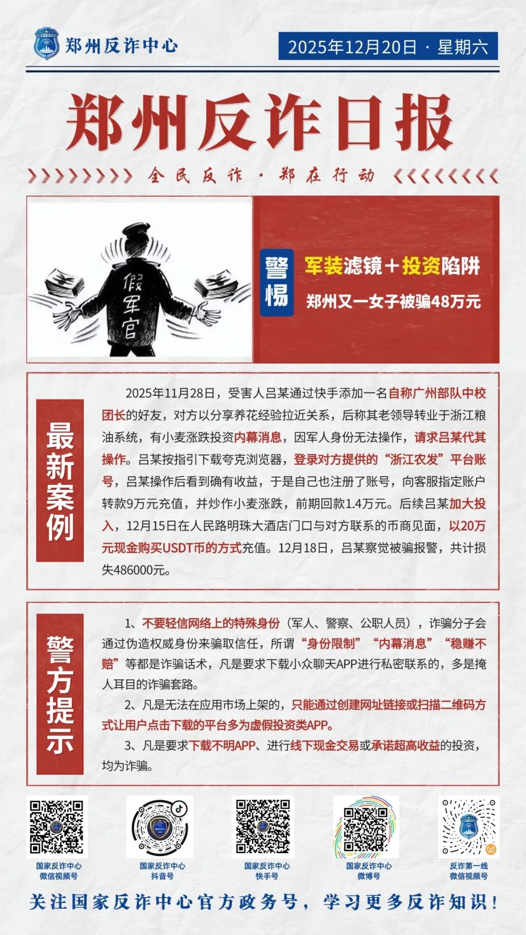 每日反詐|軍裝濾鏡+投資陷阱,鄭州又一女子被騙48萬!