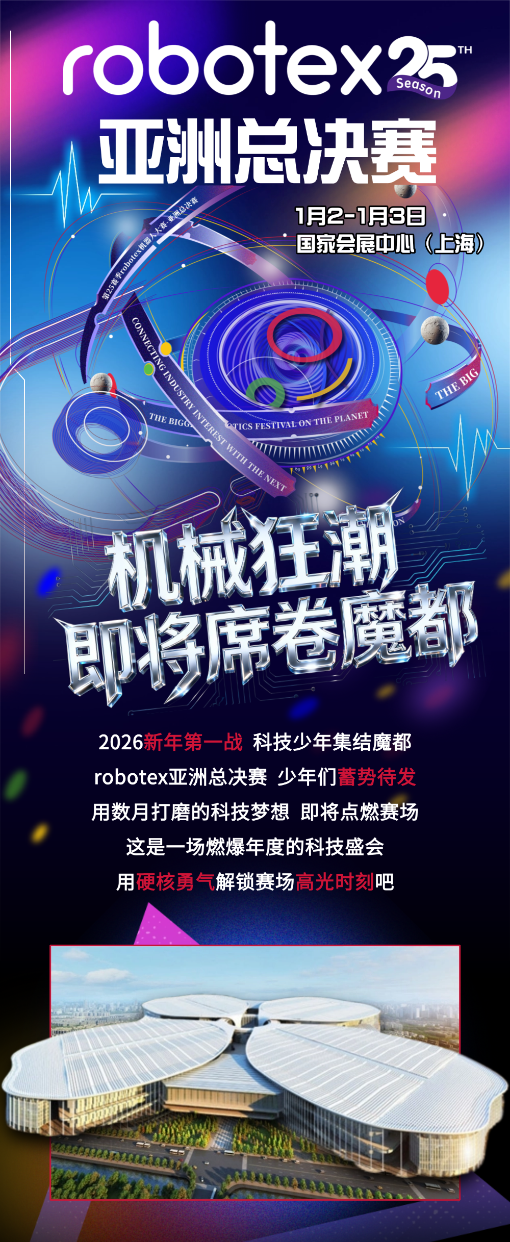 上海虹橋商務區管理委員會介紹,robotex亞洲總決賽將于2026年1月2日至3日在國家會展中心(上海)5.2H和6.2H兩大展館舉辦,會場面積超過30000平方米,無柱式開闊空間讓機器人盡情炫技?,F場有無人機表演、VR科普、凈化者機甲等前沿黑科技等你體驗。微信搜索Robotex小程序即可免費預約門票。詳見↓