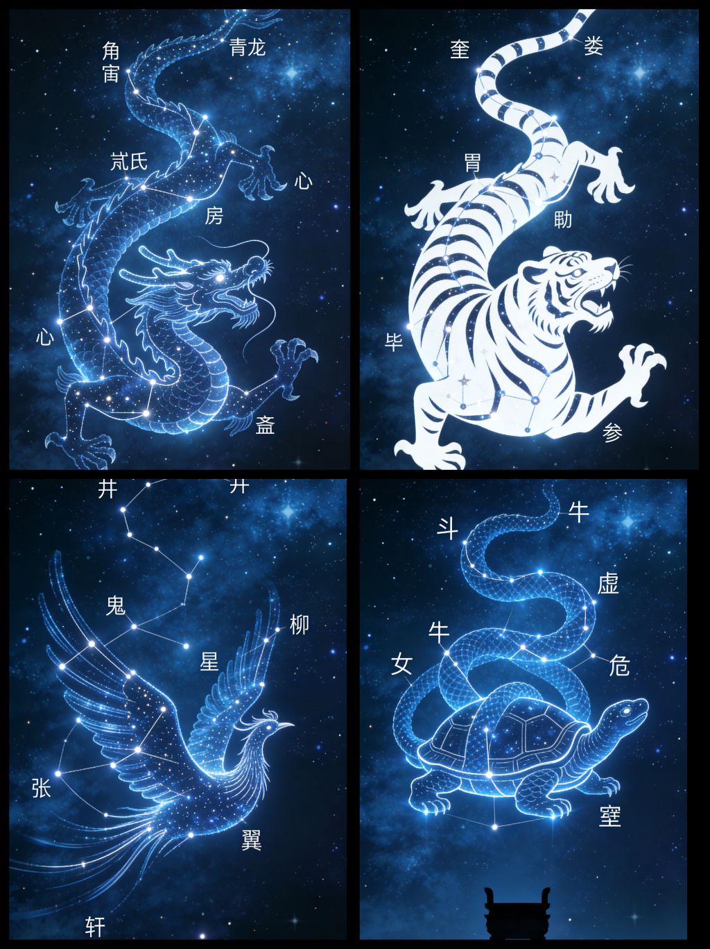 四神獸又稱四靈、四象,是指青龍、白虎、朱雀、玄武,它們是遠古星宿崇拜的產物,分別代表東、西、南、北四個方向。