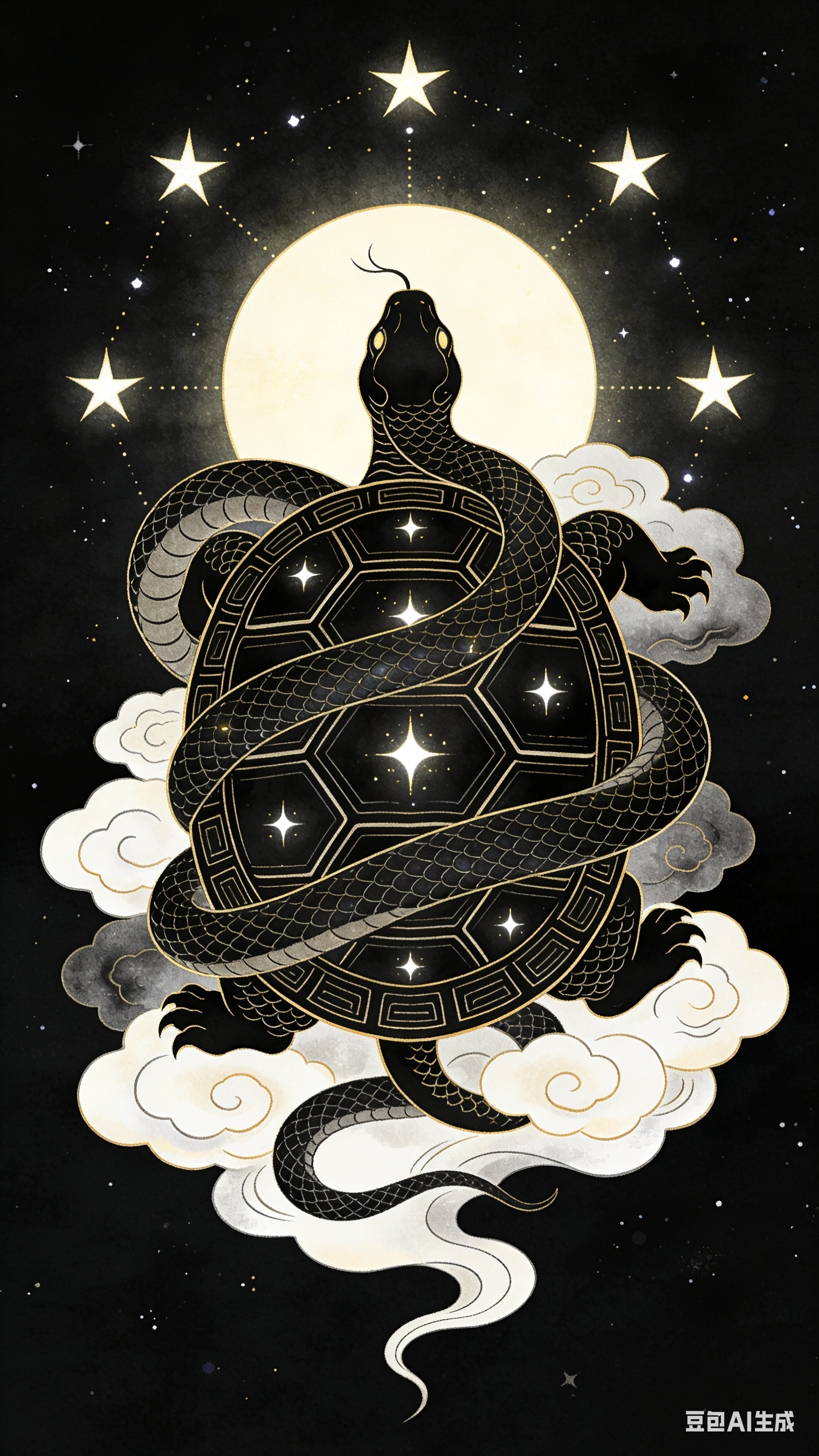 玄武:是守護北方的神獸,五行屬水,色黑。其形象是龜和蛇的組合。在二十八宿中,北方的斗、牛、女、虛、危、室、壁七宿形如龜,稱為玄武。玄武代表冬季,有長壽、守護的寓意。
