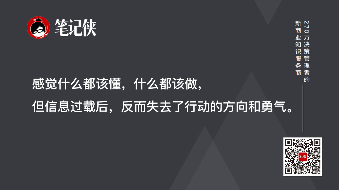 這導(dǎo)致了“決策癱瘓”:感覺什么都該懂,什么都該做,但信息過載后,反而失去了行動的方向和勇氣。