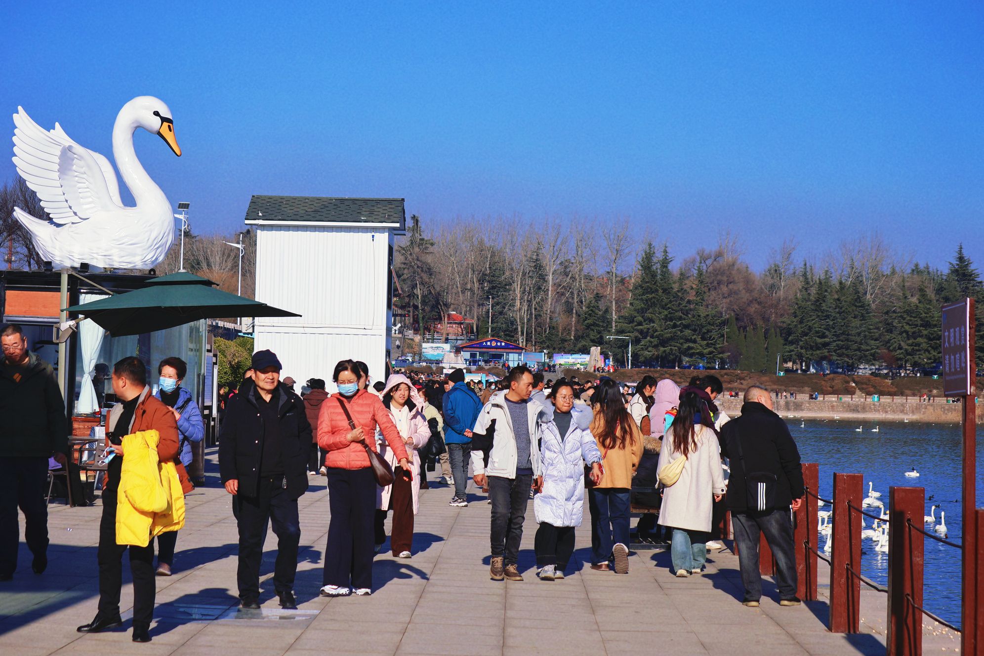 天鵝湖國家城市濕地公園是這場冬日盛宴的核心舞臺。截至11月底,已有兩千多只大天鵝在此棲息,12月至次年2月更是種群峰值期,萬余只白衣仙客游弋湖面、展翅盤旋,紅喙白羽映著湛藍湖水,構成治愈人心的生態畫卷。青龍湖的開闊湖面是拍全景的絕佳機位,上午9-11點的柔和光線里,天鵝群飛的場面壯闊又靈動;蒼龍湖的親水棧道深入水域,能近距離捕捉天鵝梳理羽毛、低頭覓食的細膩瞬間,蘆葦蕩作背景,自帶電影濾鏡。舉著相機蹲守片刻,便能將“天鵝踏浪”的絕美畫面收入鏡頭,成為朋友圈最亮眼的風景。